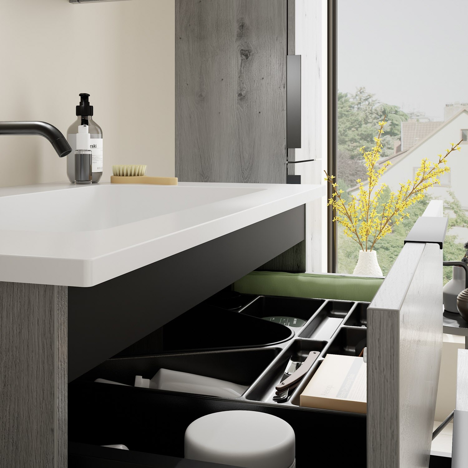 - 1 Schublade oben, 35 cm tief, mit Siphonausschnitt und Inneneinteilung
