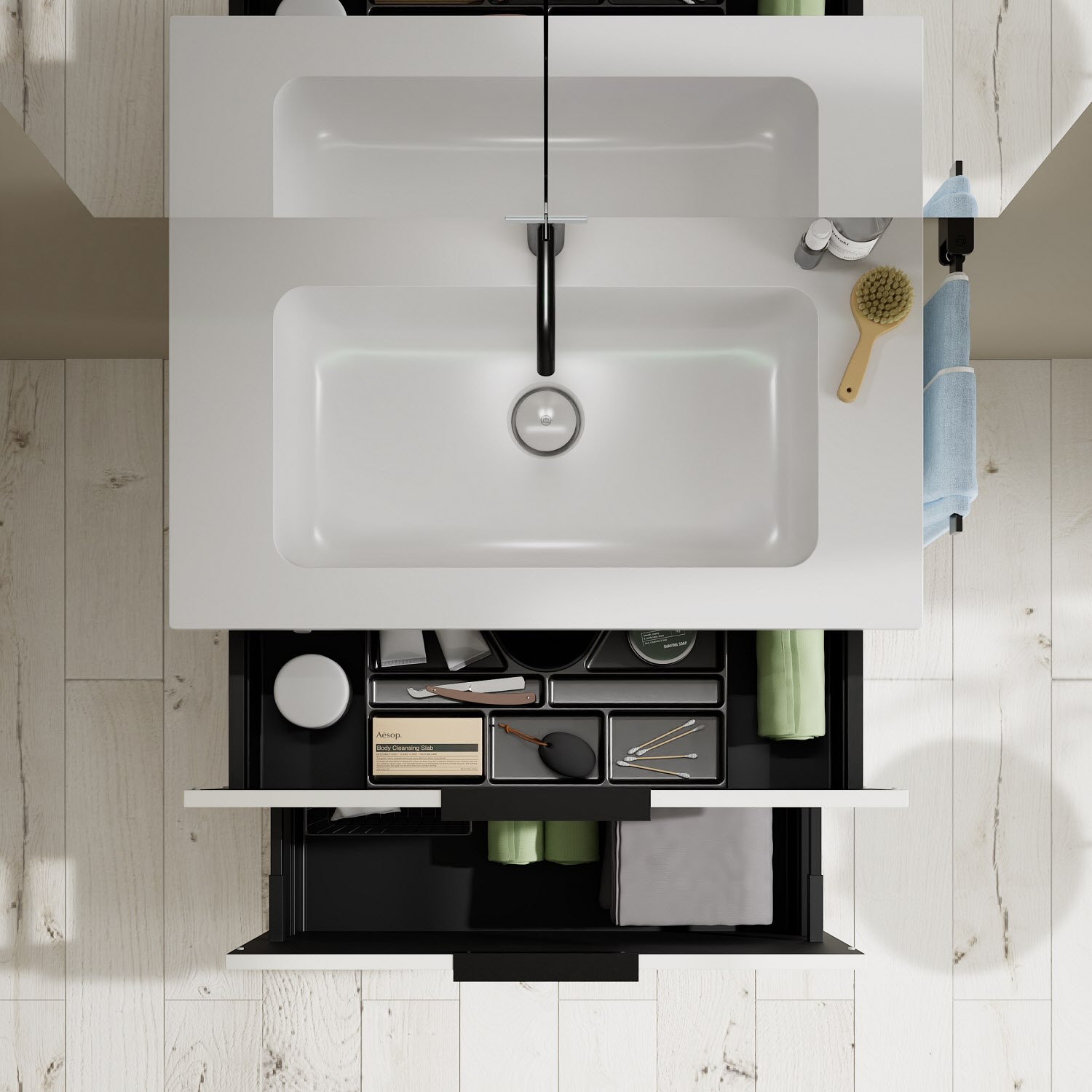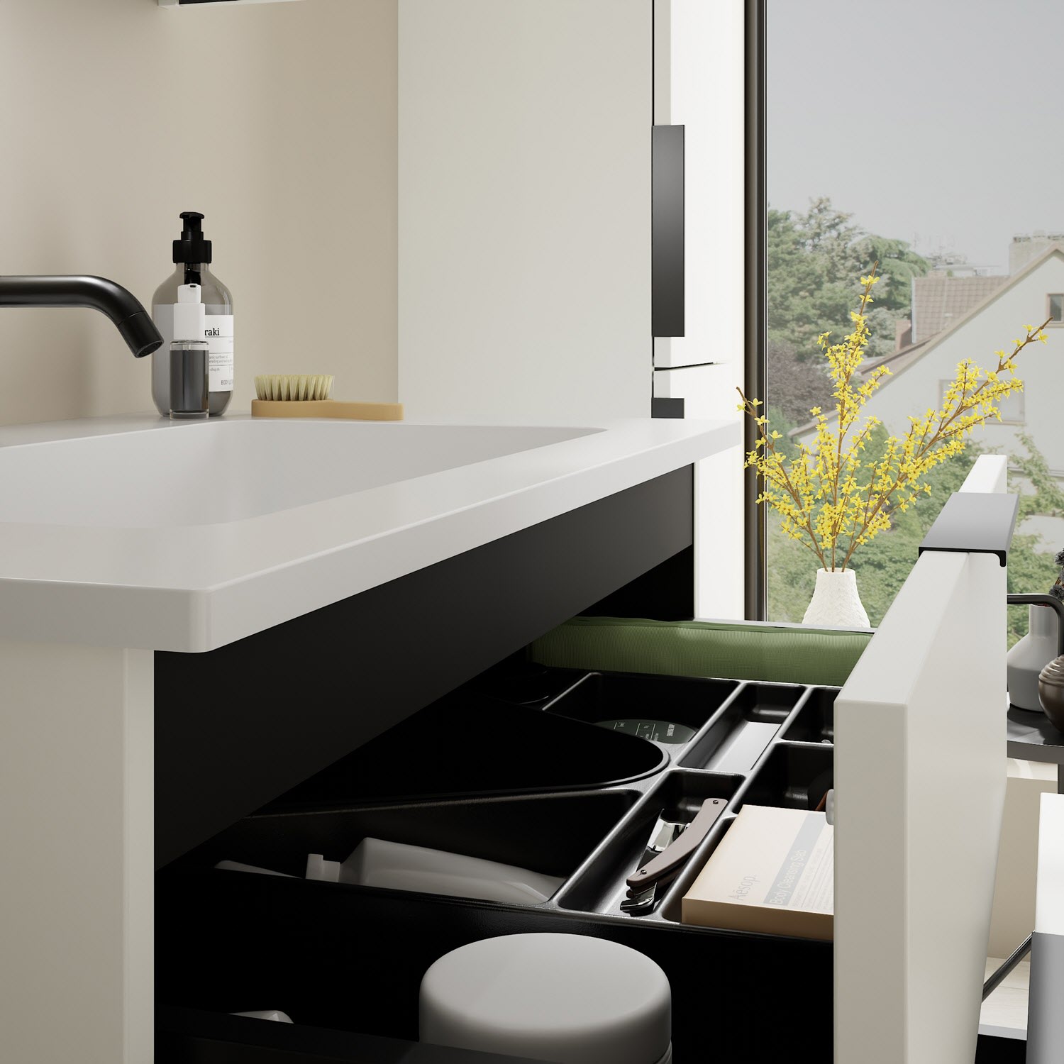 - 1 Schublade oben, 35 cm tief, mit Siphonausschnitt und Inneneinteilung