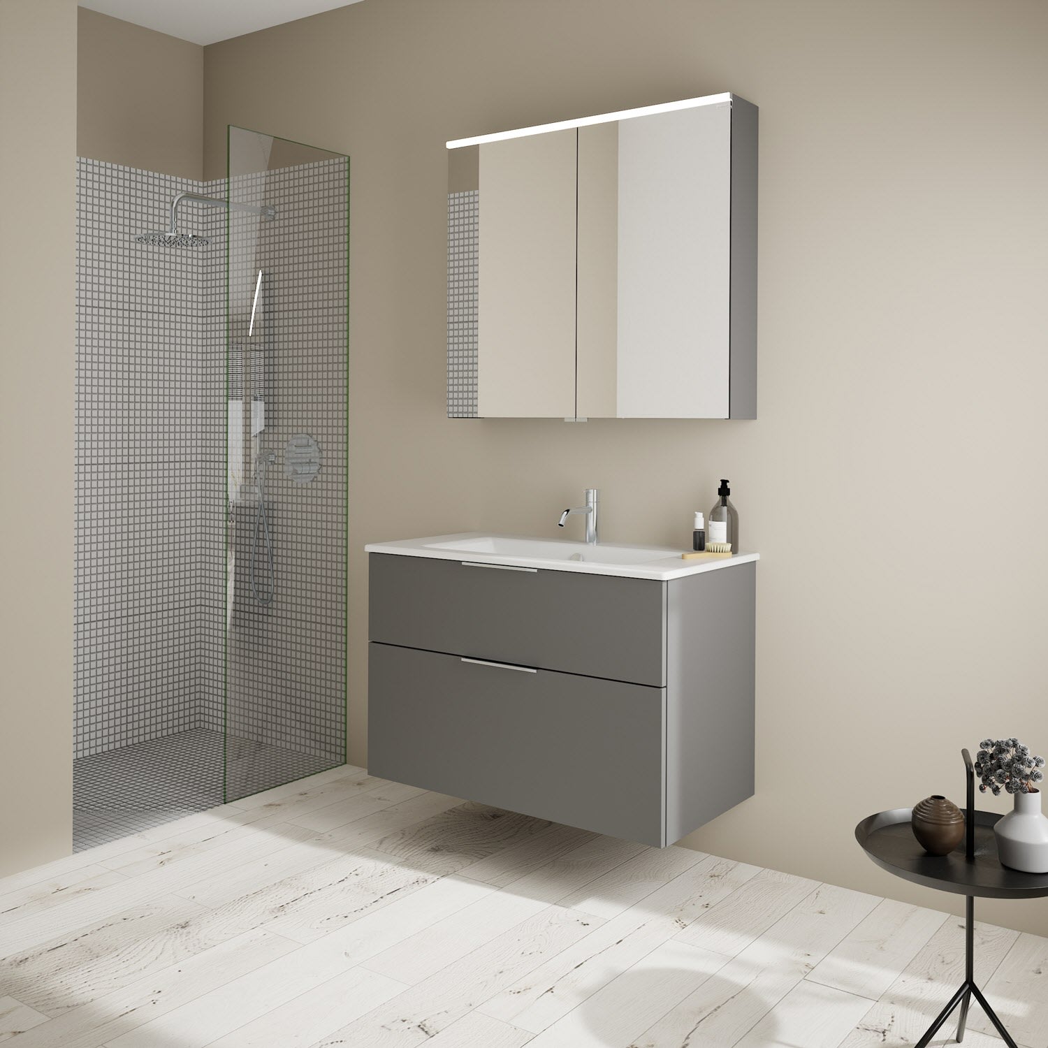burgbad Eqio Badmöbel-Set 92 cm mit Keramik-Waschtisch Slim und Unterschrank mit Griff G0146, mit Spiegelschrank