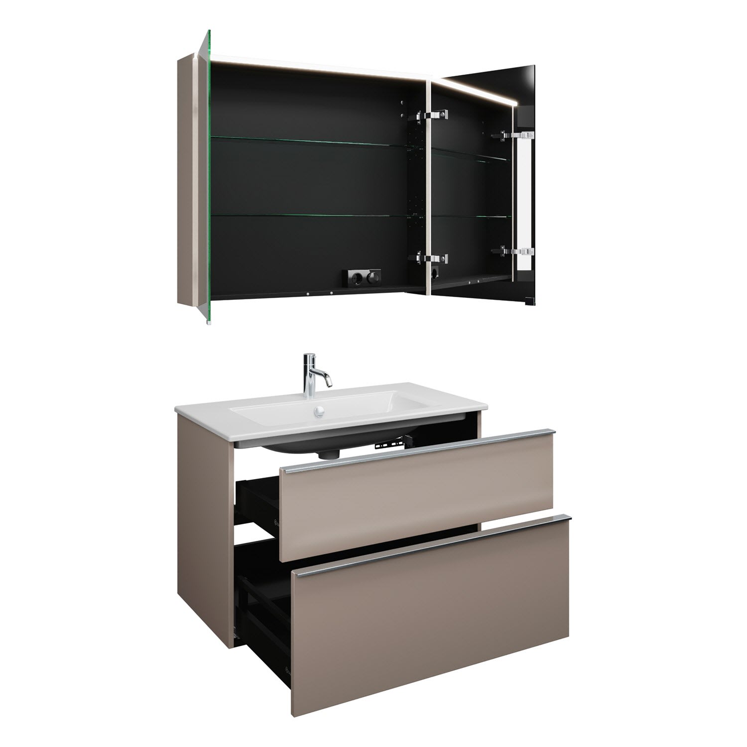 - 1 Schublade oben, 35 cm tief, mit Siphonausschnitt und Inneneinteilung