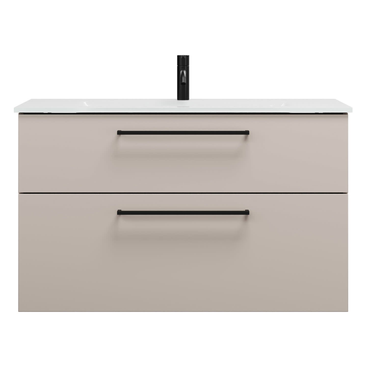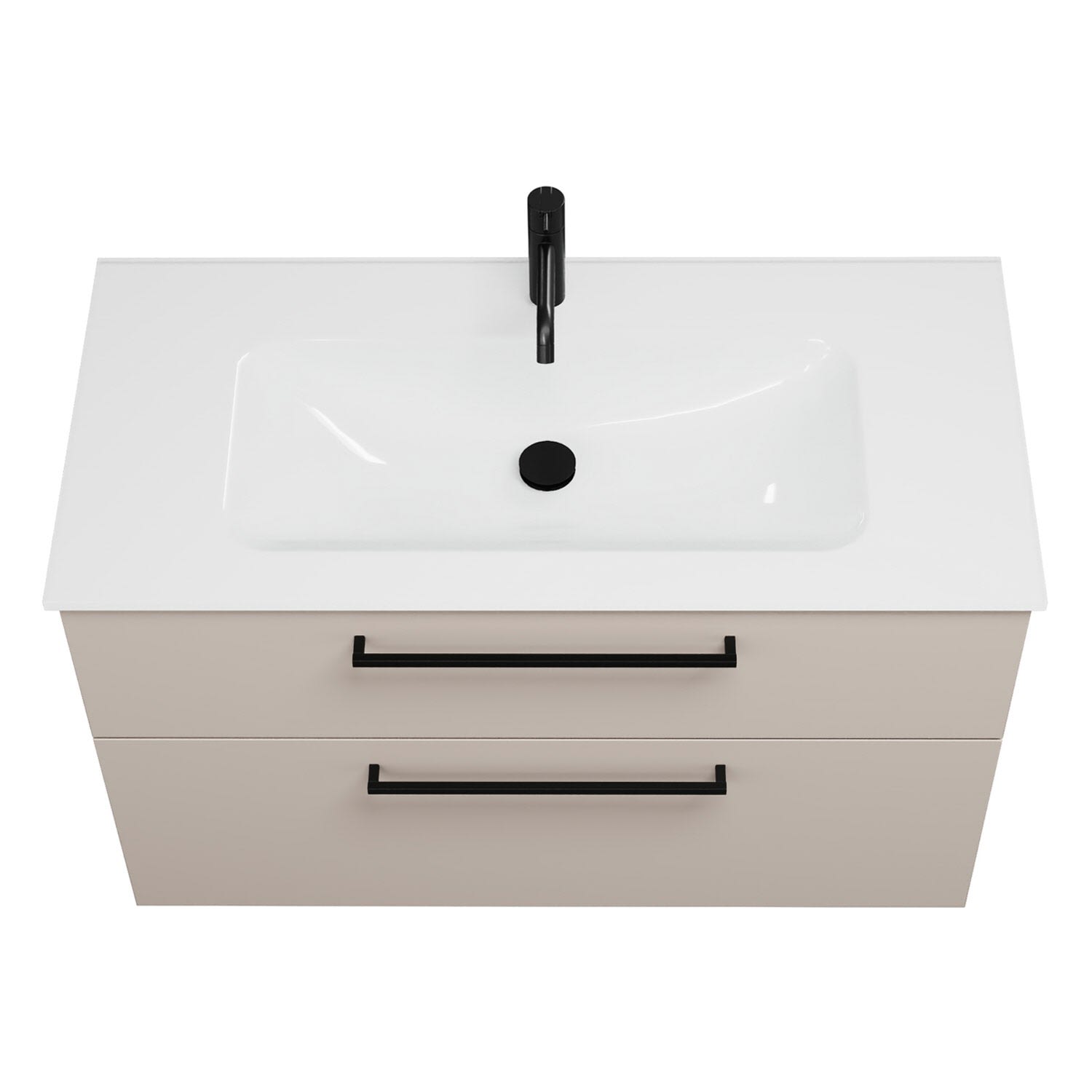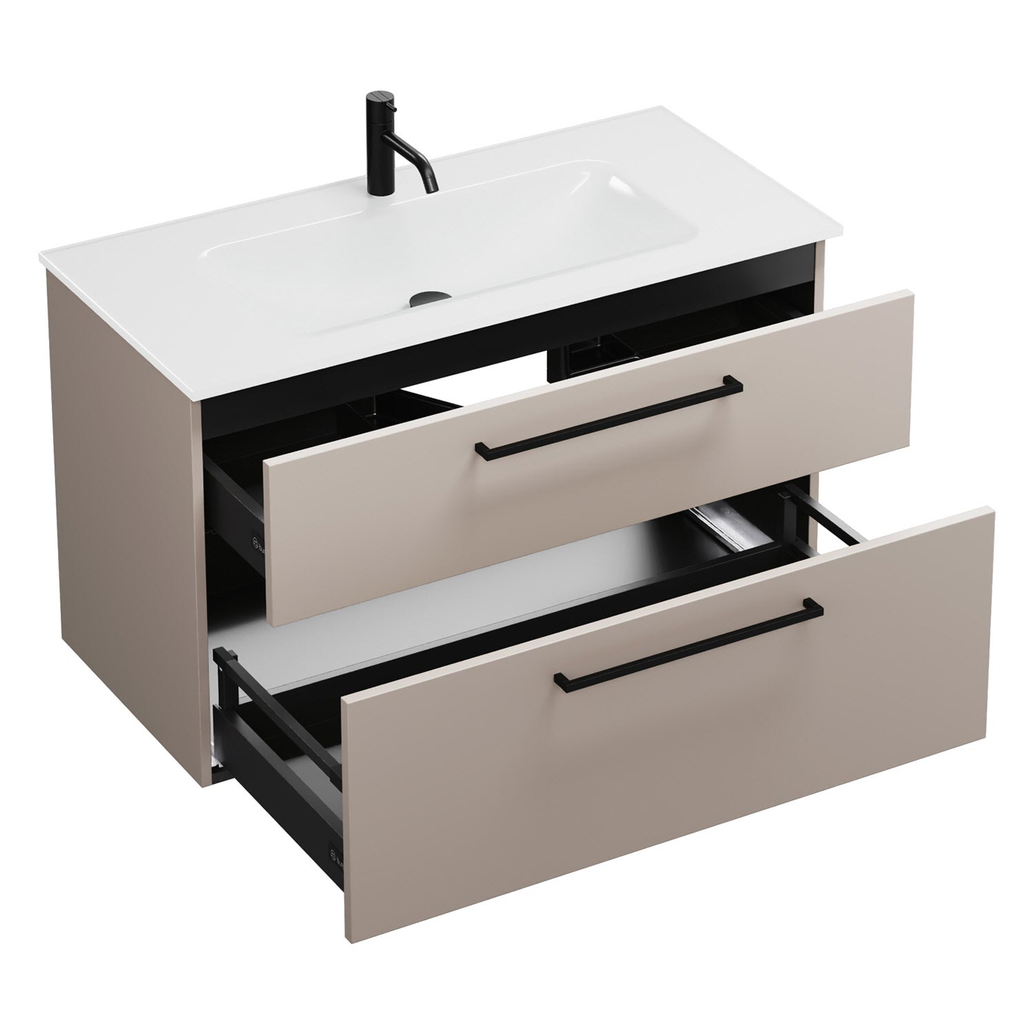 - 1 Schublade oben, 35 cm tief, mit Siphonausschnitt und Inneneinteilung