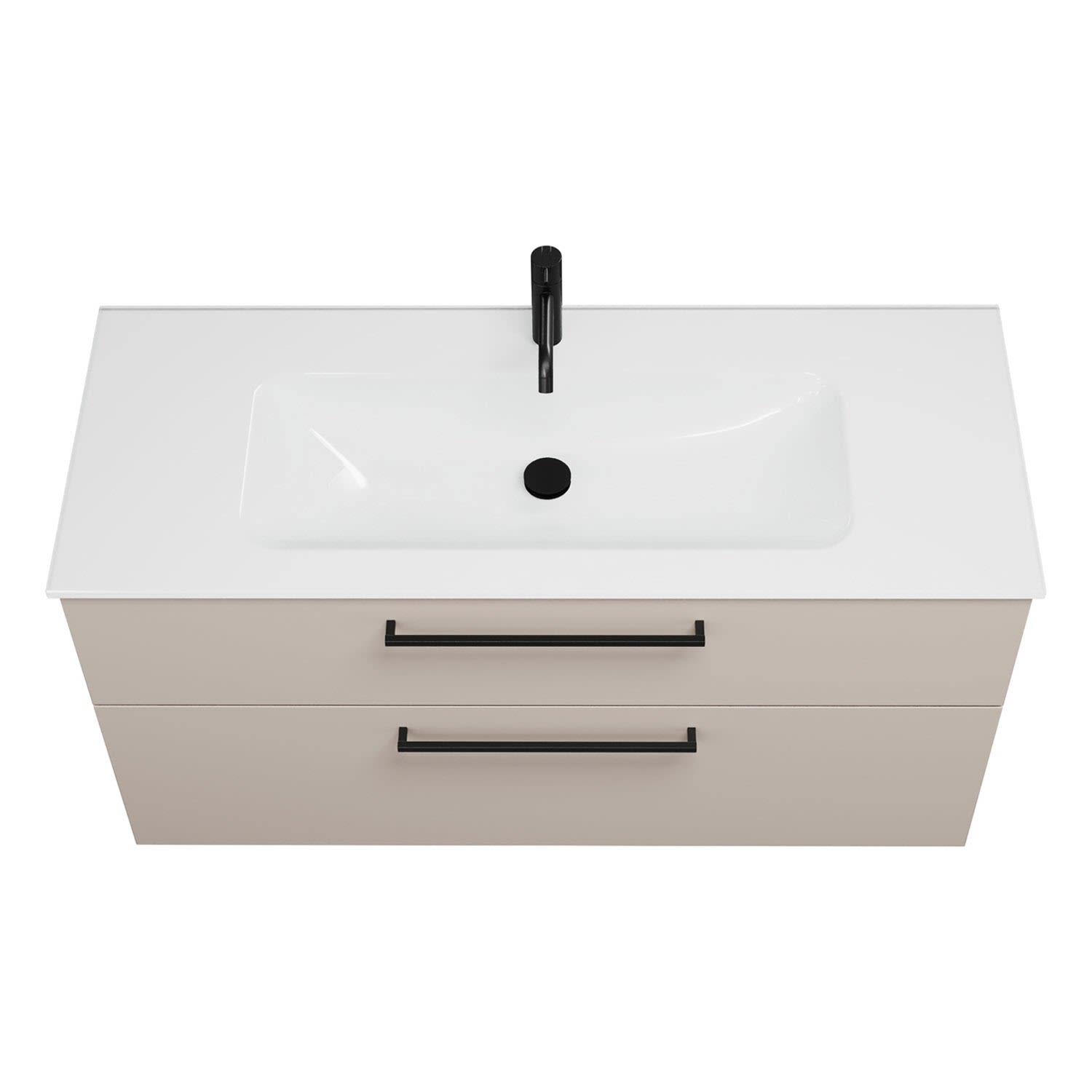 - 1 Schublade oben, 35 cm tief, mit Siphonausschnitt und Inneneinteilung