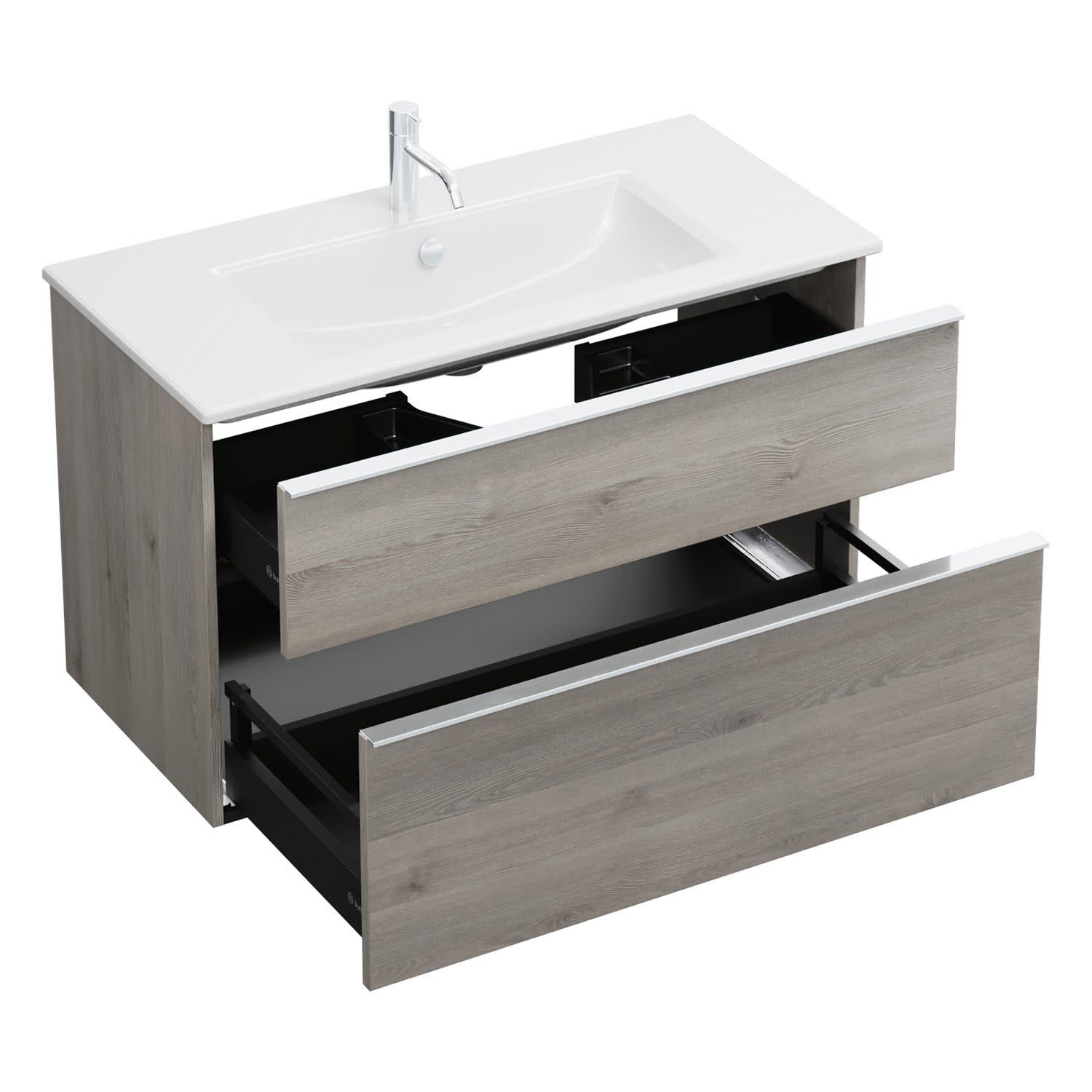 - 1 Schublade oben, 35 cm tief, mit Siphonausschnitt und Inneneinteilung