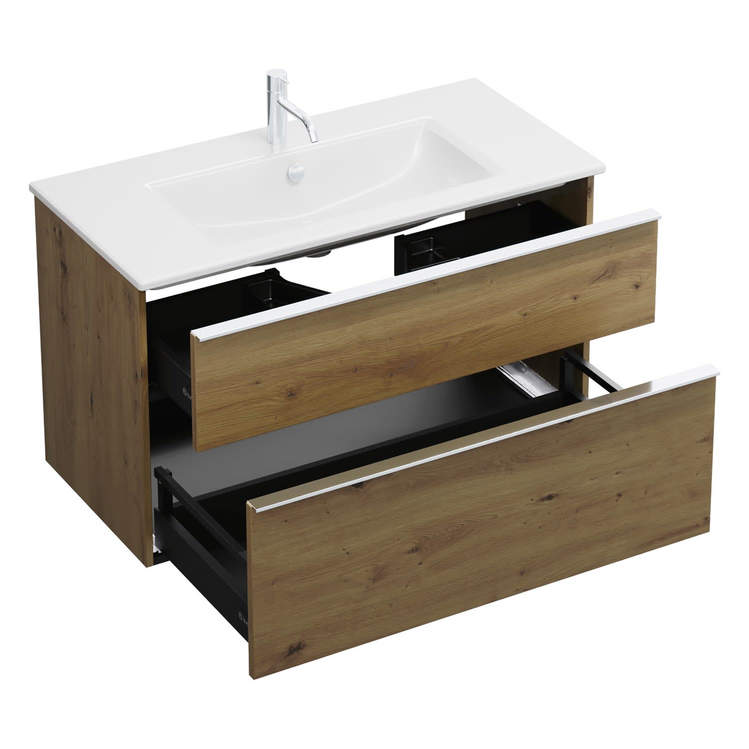 - 1 Schublade oben, 35 cm tief, mit Siphonausschnitt und Inneneinteilung