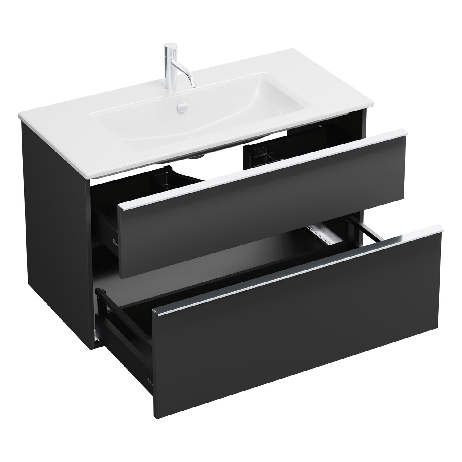 - 1 Schublade oben, 35 cm tief, mit Siphonausschnitt und Inneneinteilung