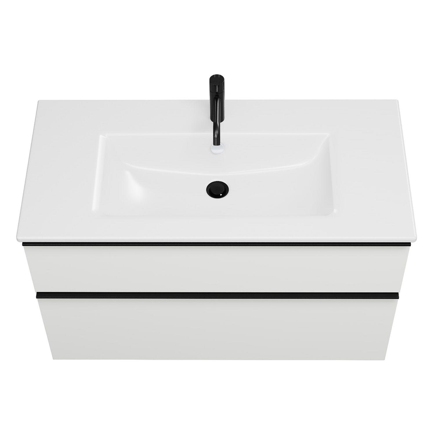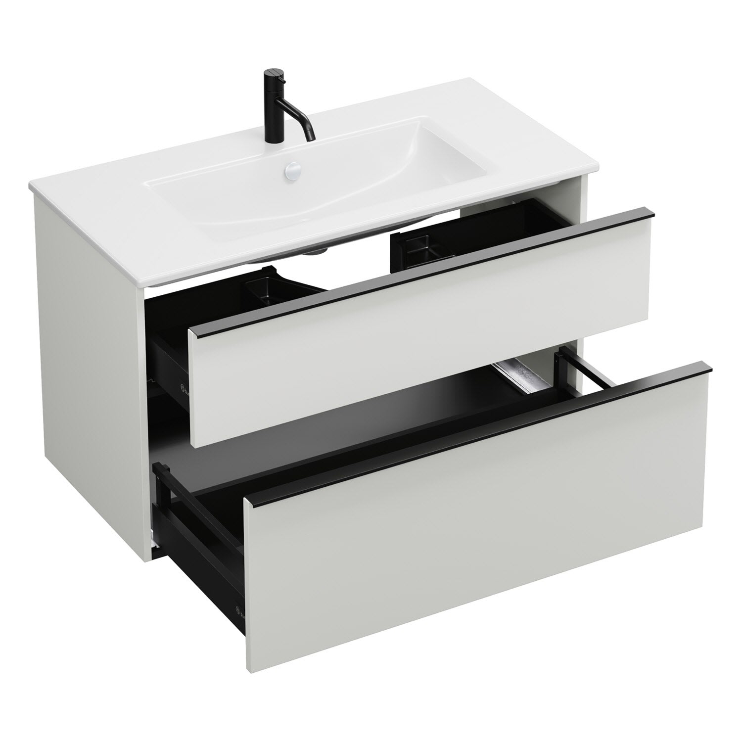 - 1 Schublade oben, 35 cm tief, mit Siphonausschnitt und Inneneinteilung