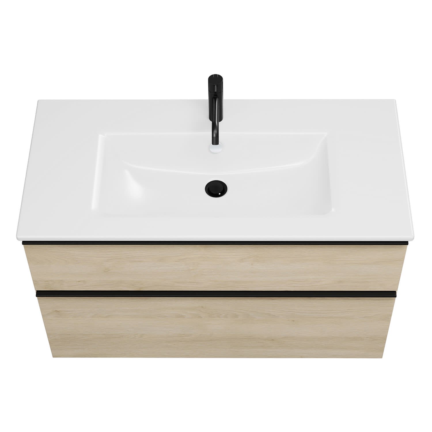 - 1 Schublade oben, 35 cm tief, mit Siphonausschnitt und Inneneinteilung