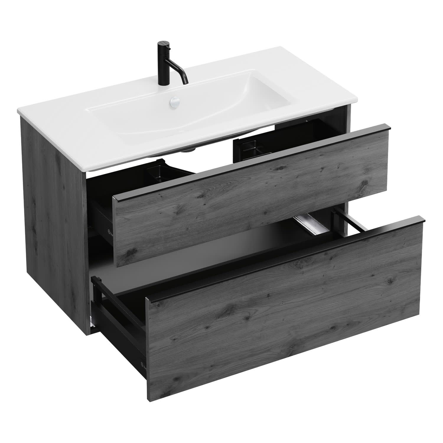 - 1 Schublade oben, 35 cm tief, mit Siphonausschnitt und Inneneinteilung