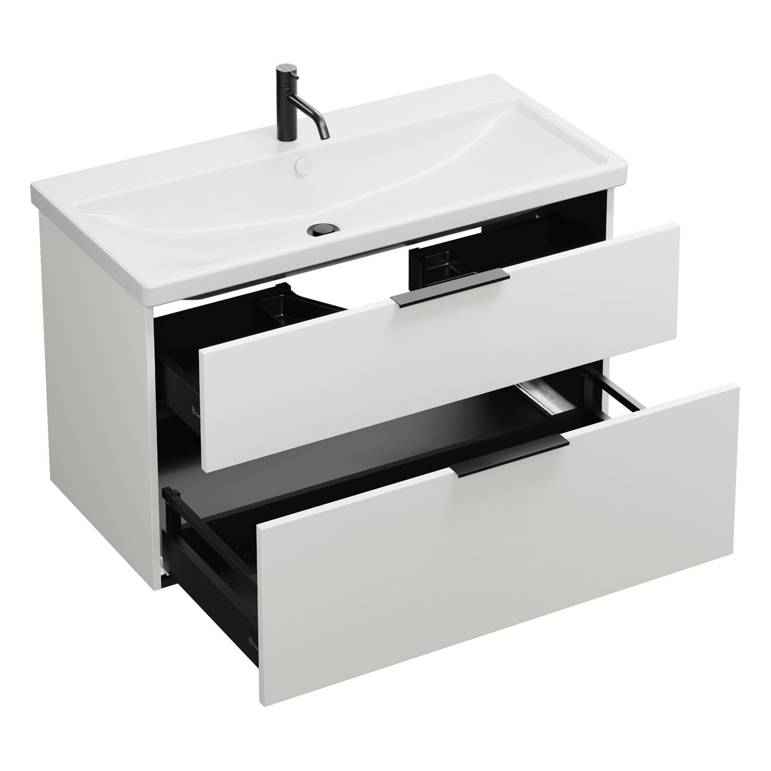 - 1 Schublade oben, 35 cm tief, mit Siphonausschnitt und Inneneinteilung
