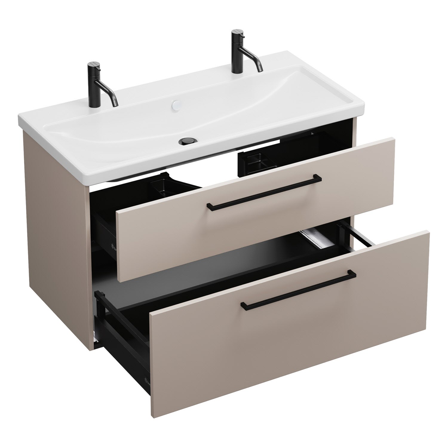 - 1 Schublade oben, 35 cm tief, mit Siphonausschnitt und Inneneinteilung