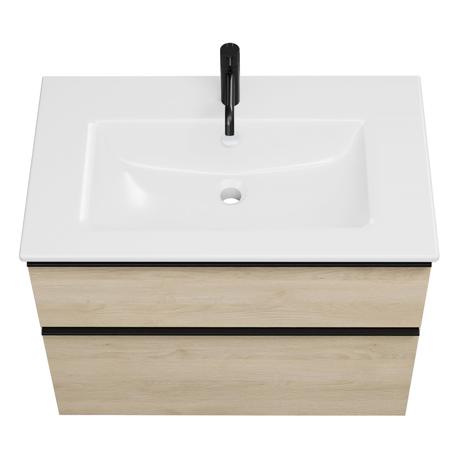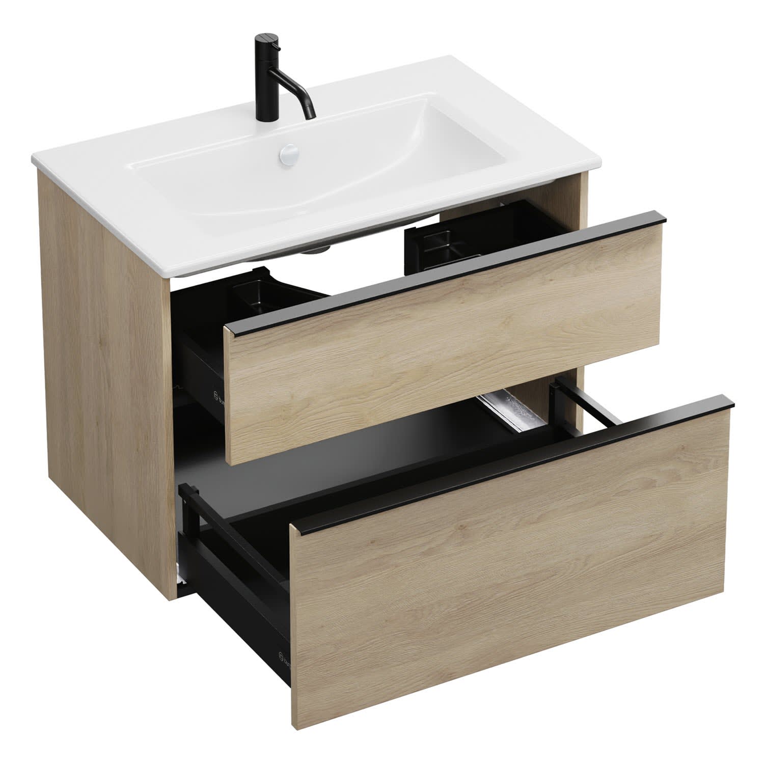 - 1 Schublade oben, 35 cm tief, mit Siphonausschnitt und Inneneinteilung