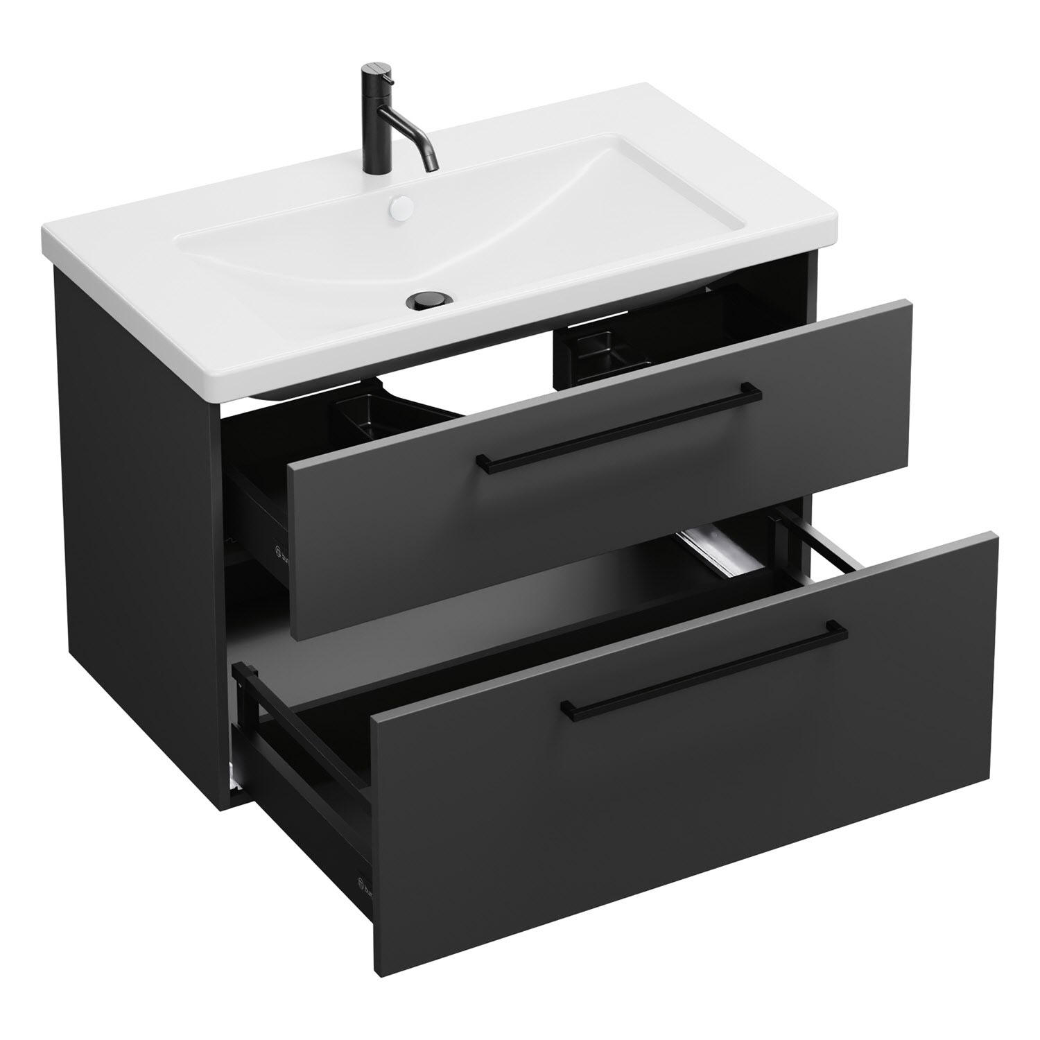 - 1 Schublade oben, 35 cm tief, mit Siphonausschnitt und Inneneinteilung