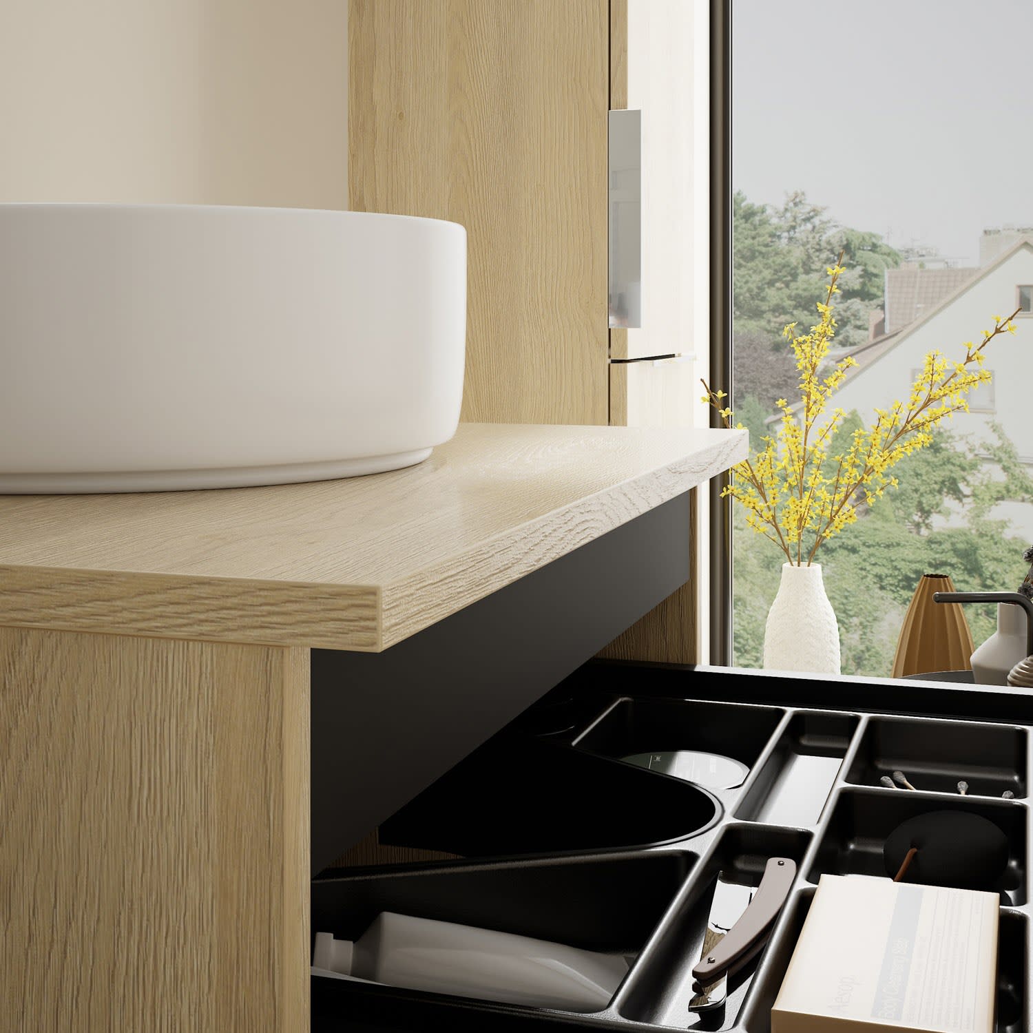 - 1 Schublade oben, 35 cm tief, mit Siphonausschnitt und Inneneinteilung