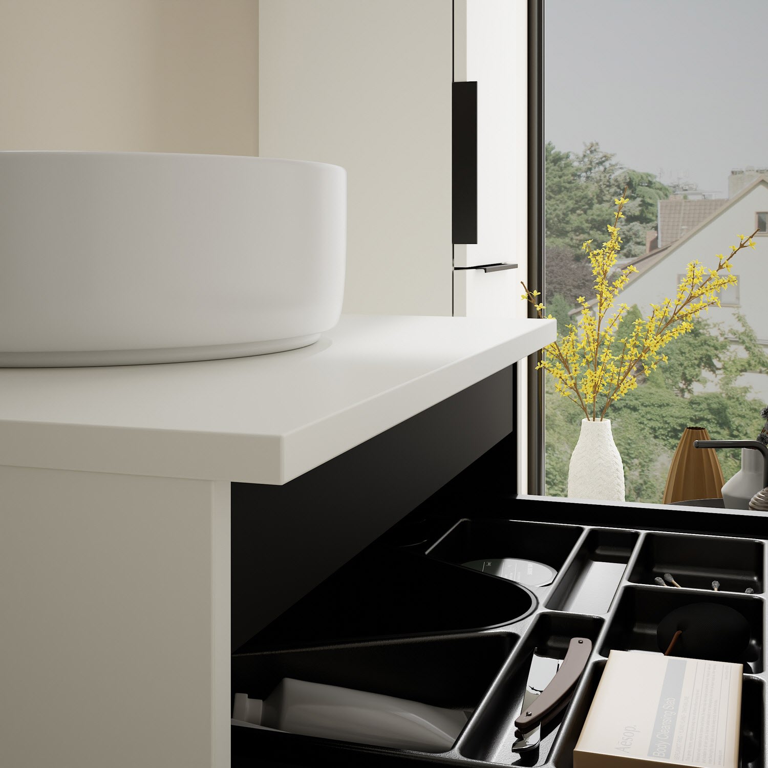 - 1 Schublade oben, 35 cm tief, mit Siphonausschnitt und Inneneinteilung