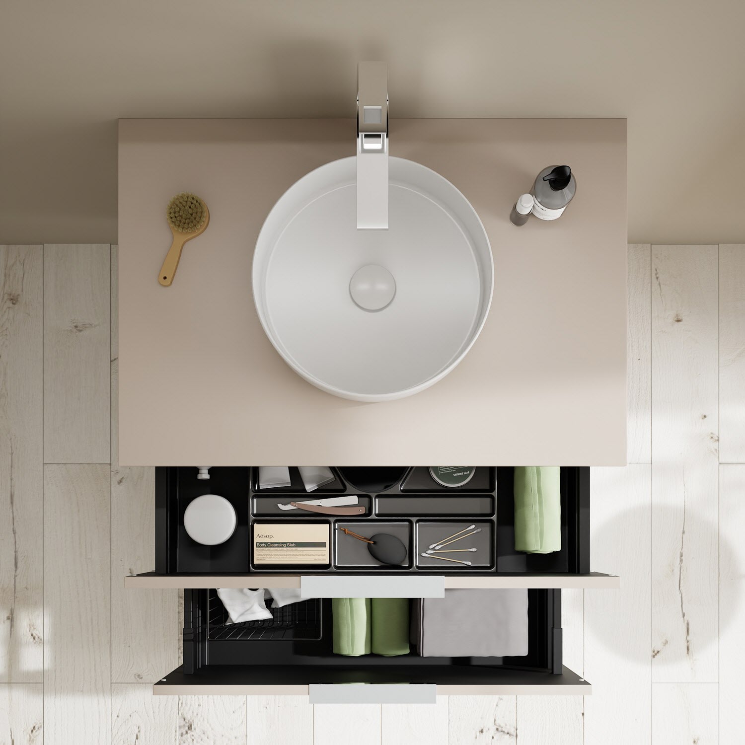 - 1 Schublade oben, 35 cm tief, mit Siphonausschnitt und Inneneinteilung