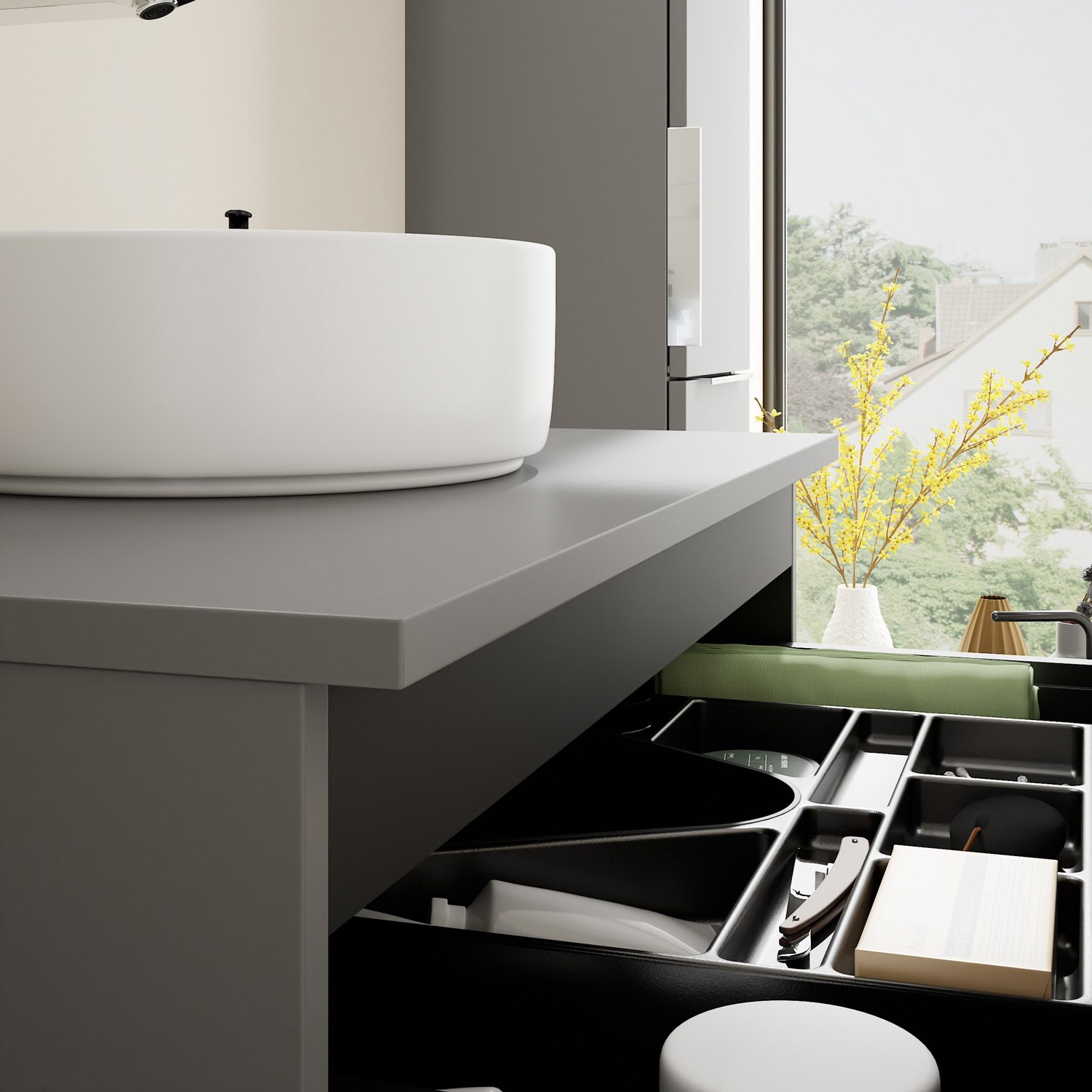 - 1 Schublade oben, 35 cm tief, mit Siphonausschnitt und Inneneinteilung