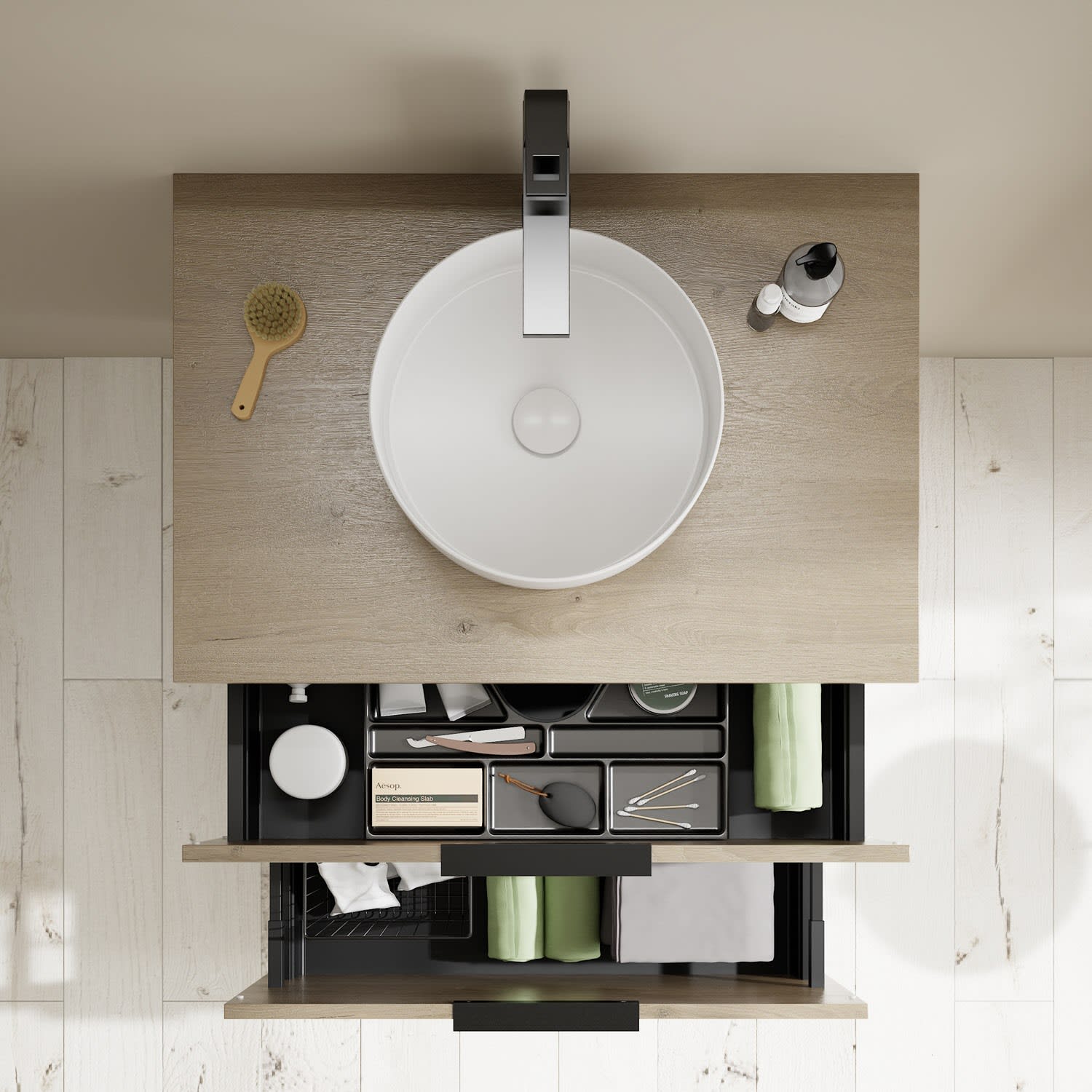 - 1 Schublade oben, 35 cm tief, mit Siphonausschnitt und Inneneinteilung