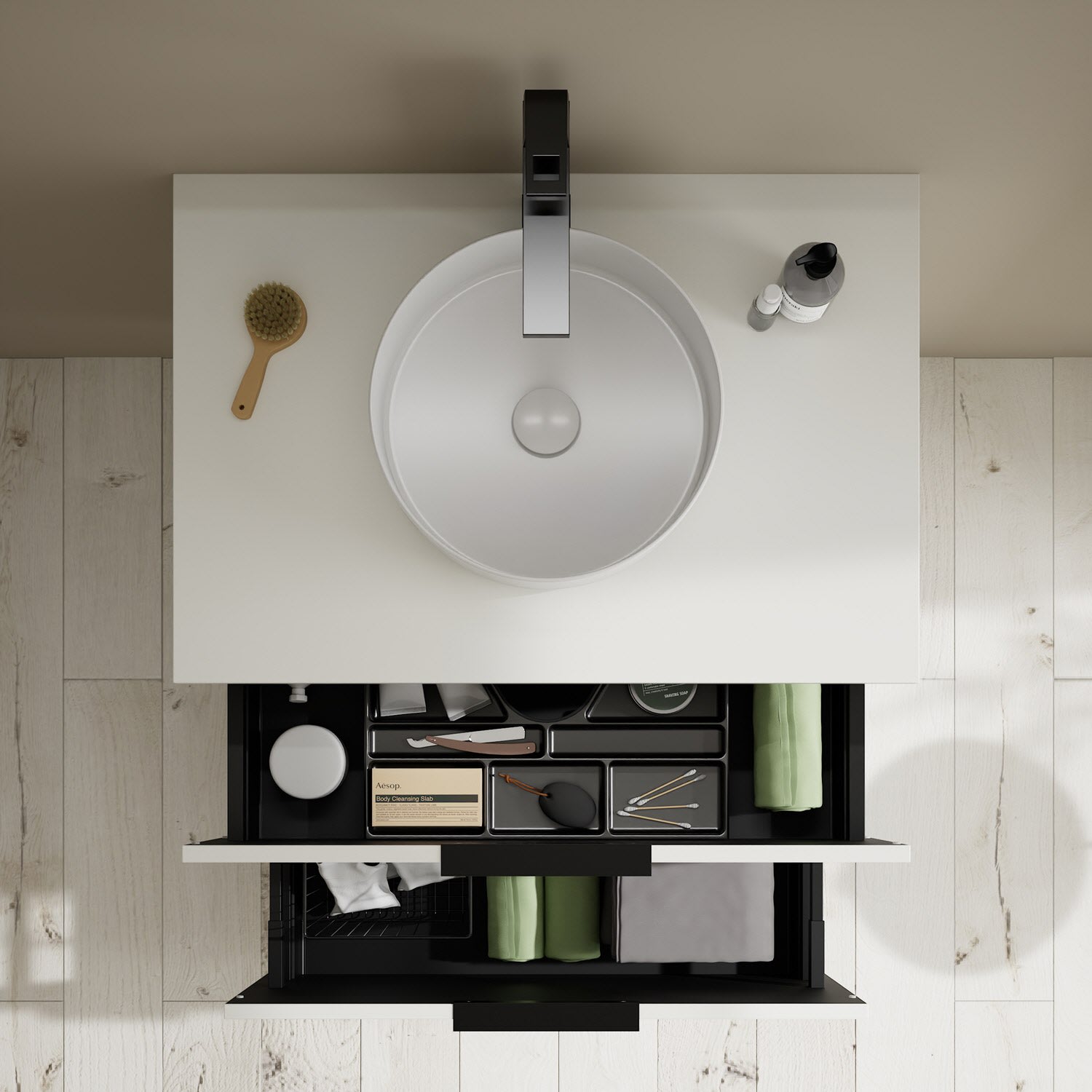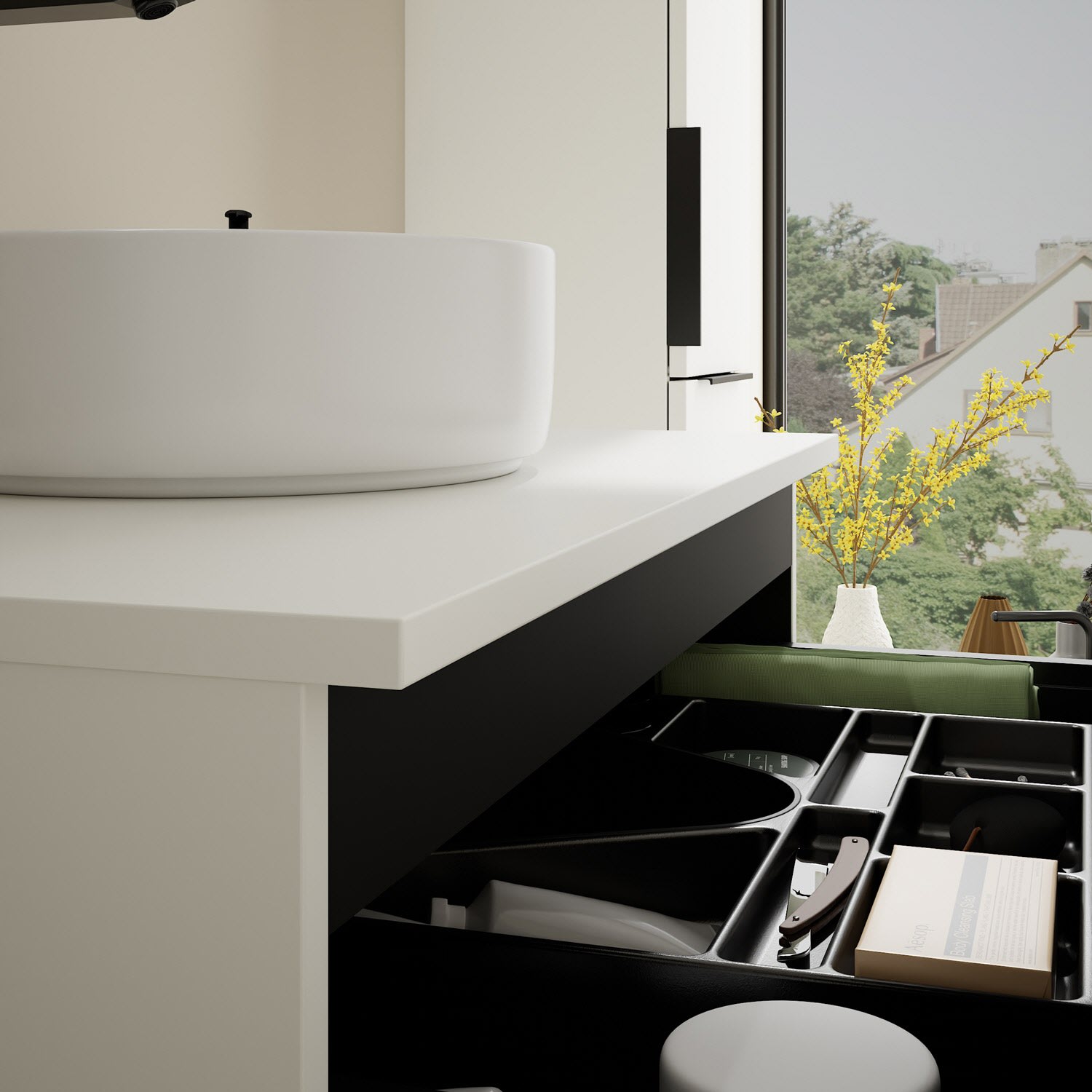 - 1 Schublade oben, 35 cm tief, mit Siphonausschnitt und Inneneinteilung