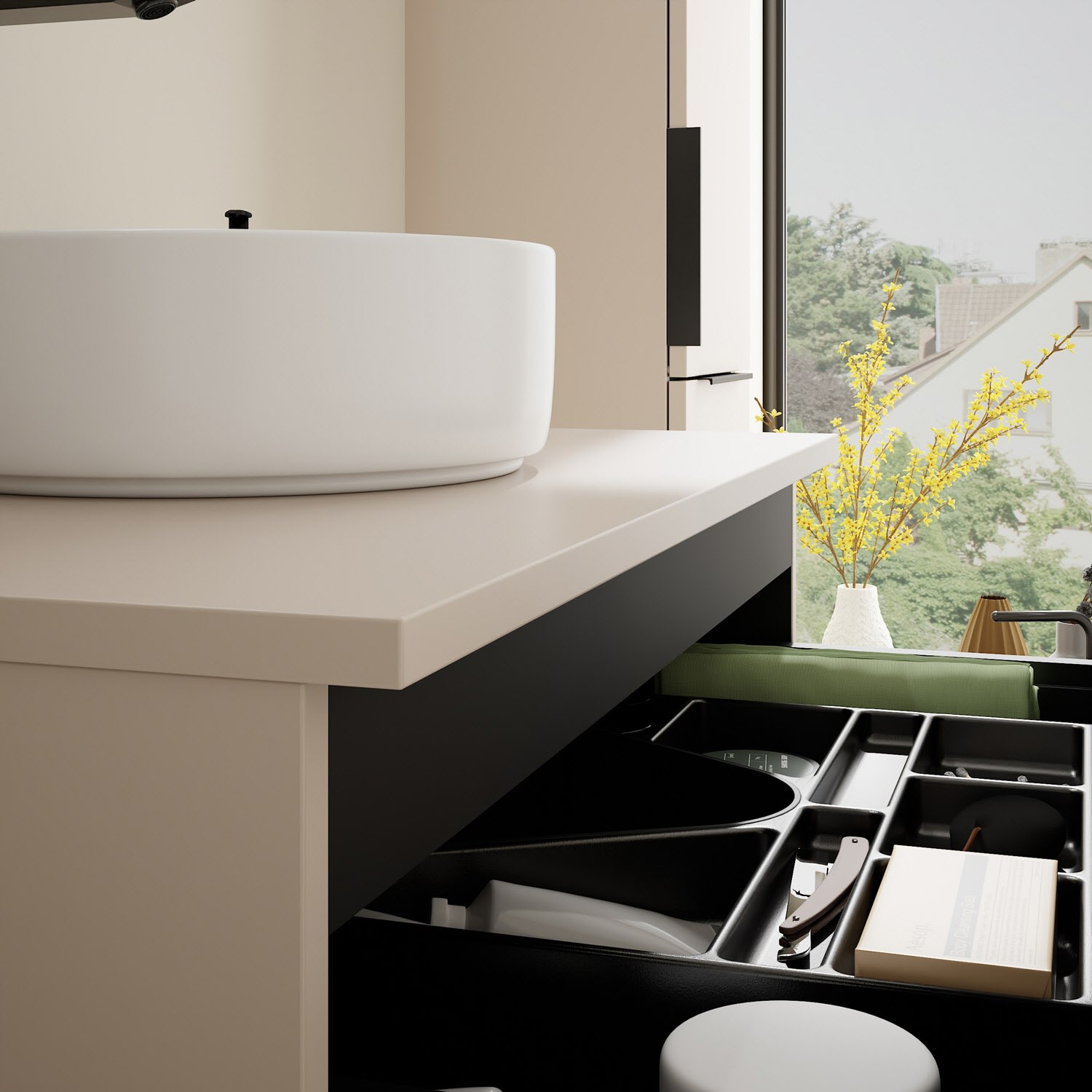 - 1 Schublade oben, 35 cm tief, mit Siphonausschnitt und Inneneinteilung