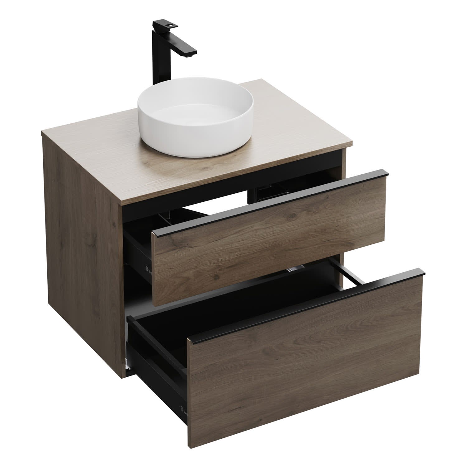 - 1 Schublade oben, 35 cm tief, mit Siphonausschnitt und Inneneinteilung