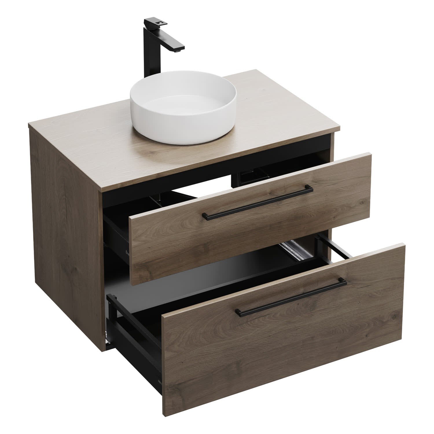 - 1 Schublade oben, 35 cm tief, mit Siphonausschnitt und Inneneinteilung