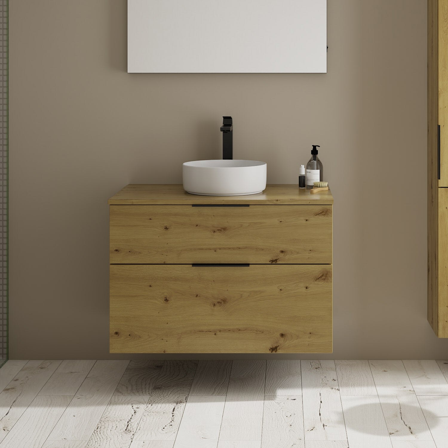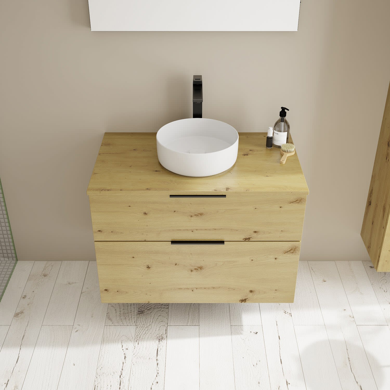 - 1 Schublade oben, 35 cm tief, mit Siphonausschnitt und Inneneinteilung