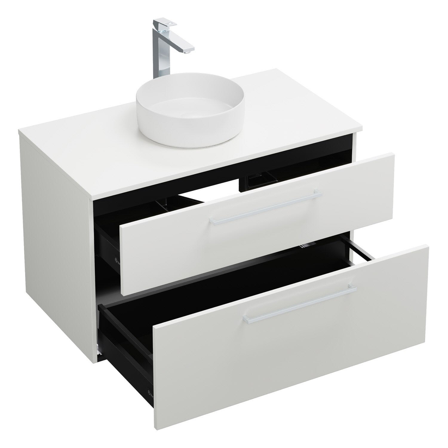 - 1 Schublade oben, 35 cm tief, mit Siphonausschnitt und Inneneinteilung