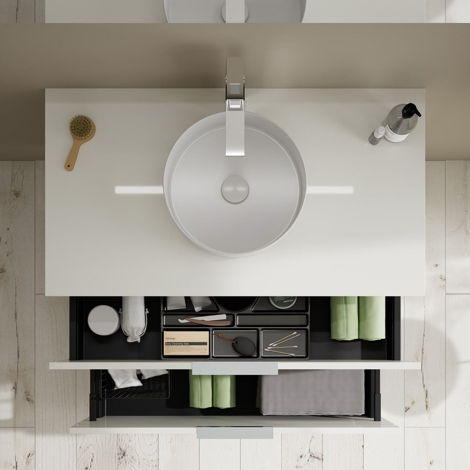 - 1 Schublade oben, 35 cm tief, mit Siphonausschnitt und Inneneinteilung