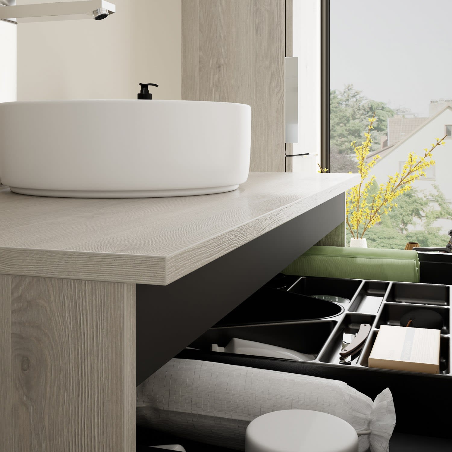 - 1 Schublade oben, 35 cm tief, mit Siphonausschnitt und Inneneinteilung