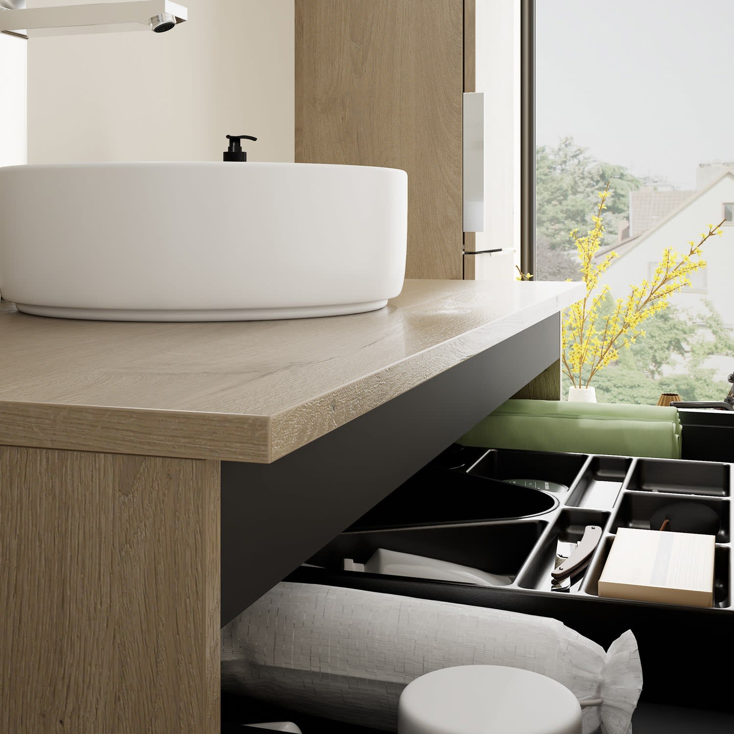 - 1 Schublade oben, 35 cm tief, mit Siphonausschnitt und Inneneinteilung