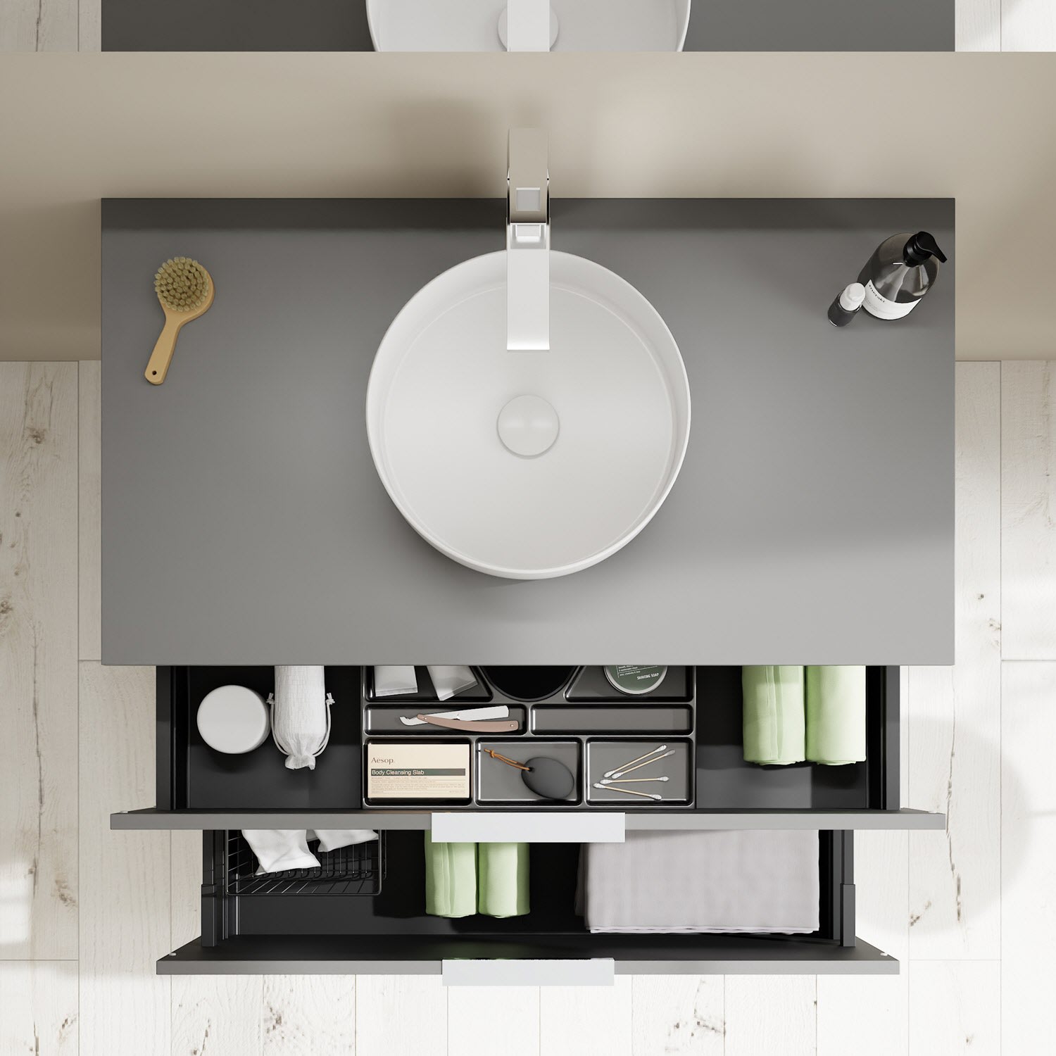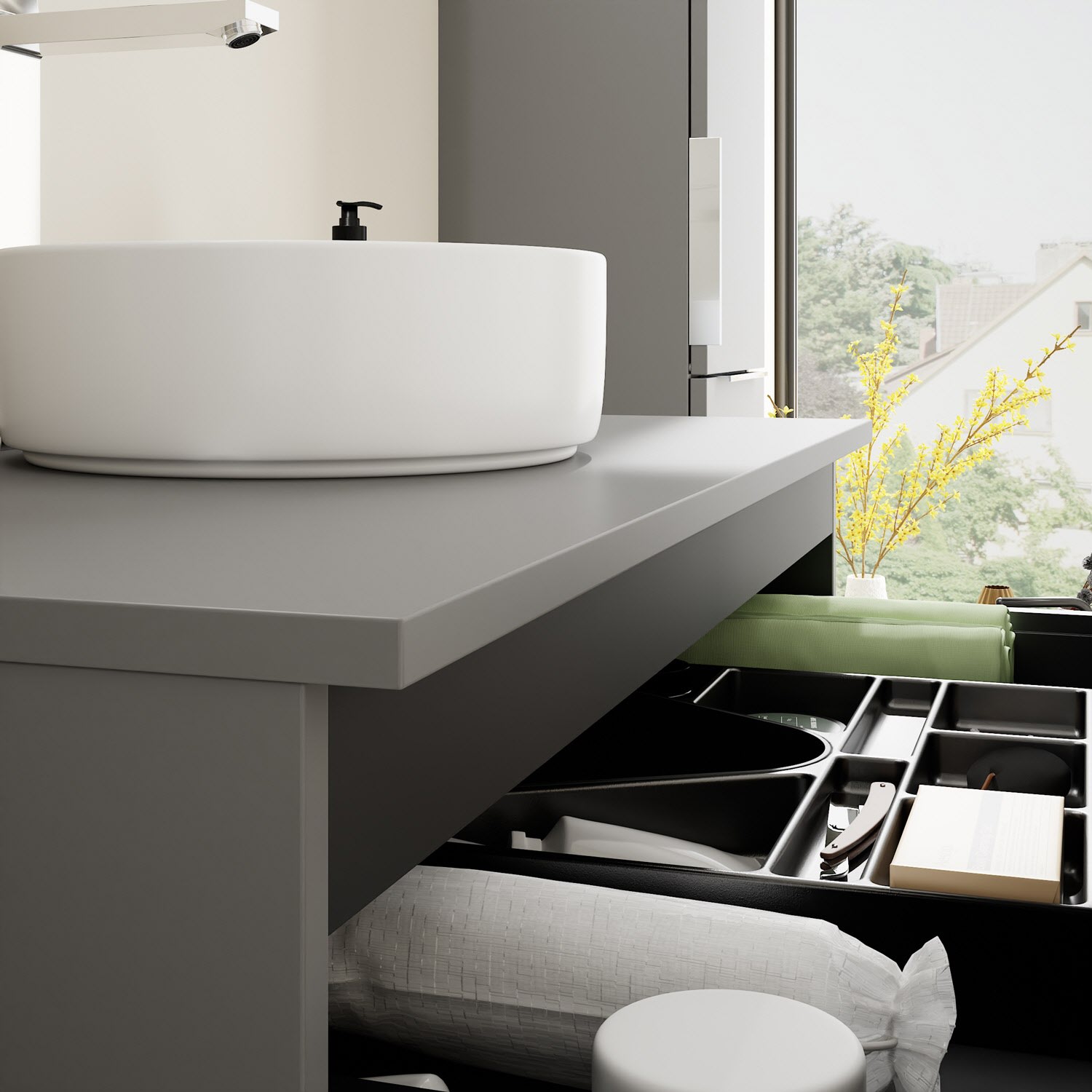 - 1 Schublade oben, 35 cm tief, mit Siphonausschnitt und Inneneinteilung