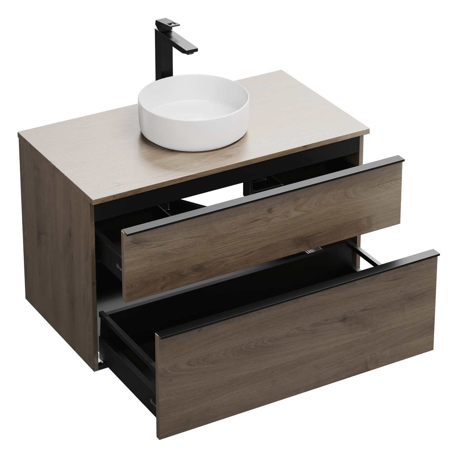 - 1 Schublade oben, 35 cm tief, mit Siphonausschnitt und Inneneinteilung