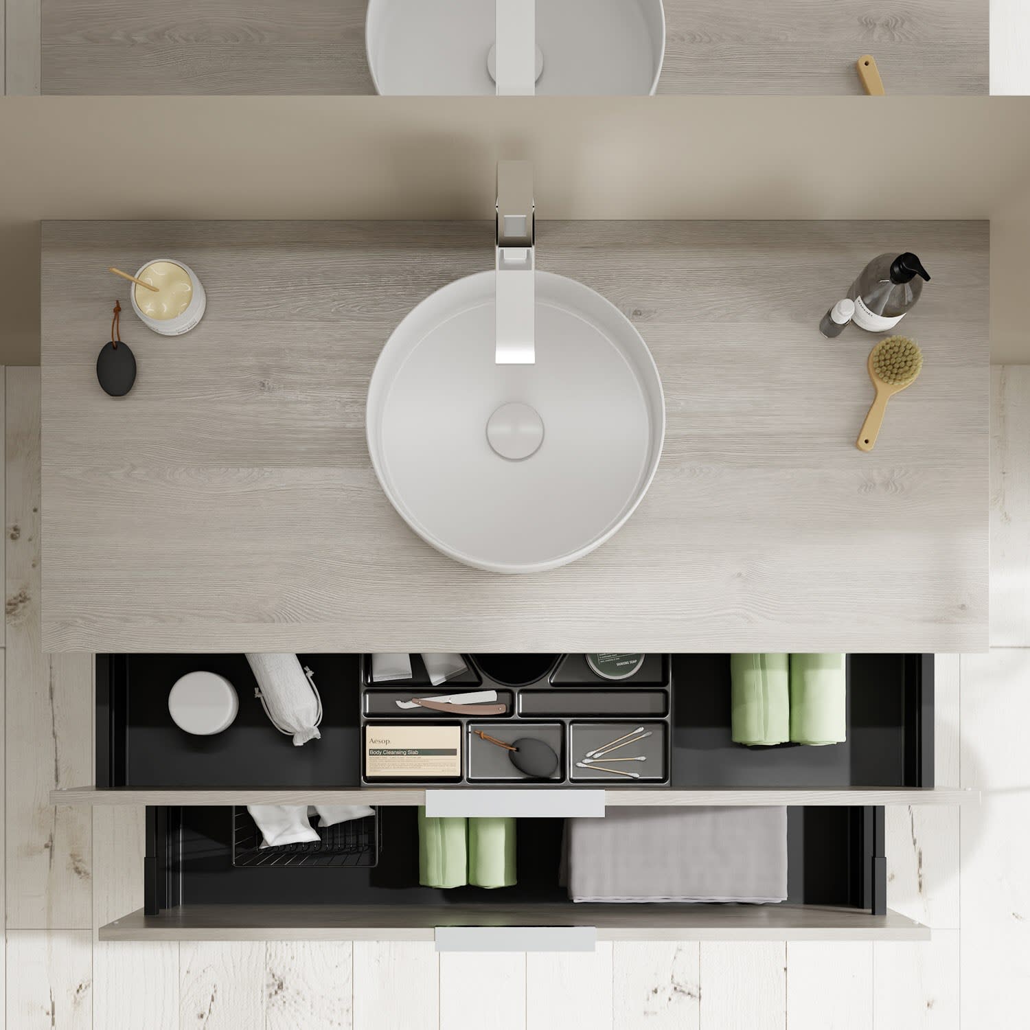- 1 Schublade oben, 35 cm tief, mit Siphonausschnitt und Inneneinteilung