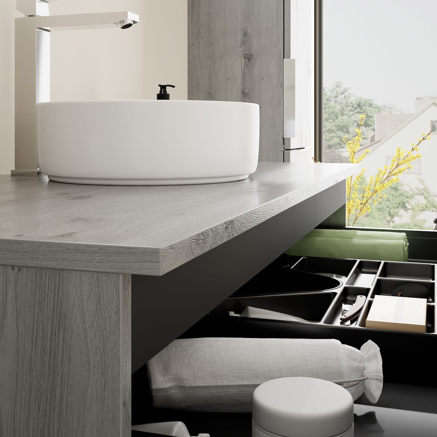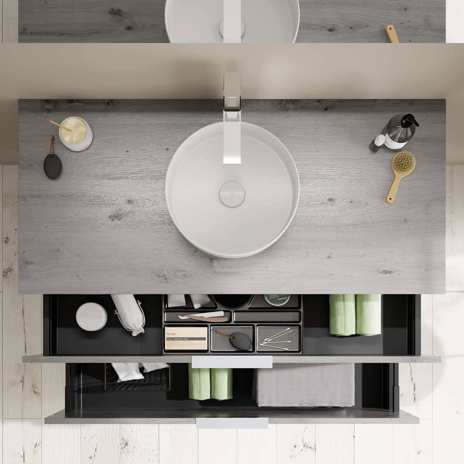 - 1 Schublade oben, 35 cm tief, mit Siphonausschnitt und Inneneinteilung