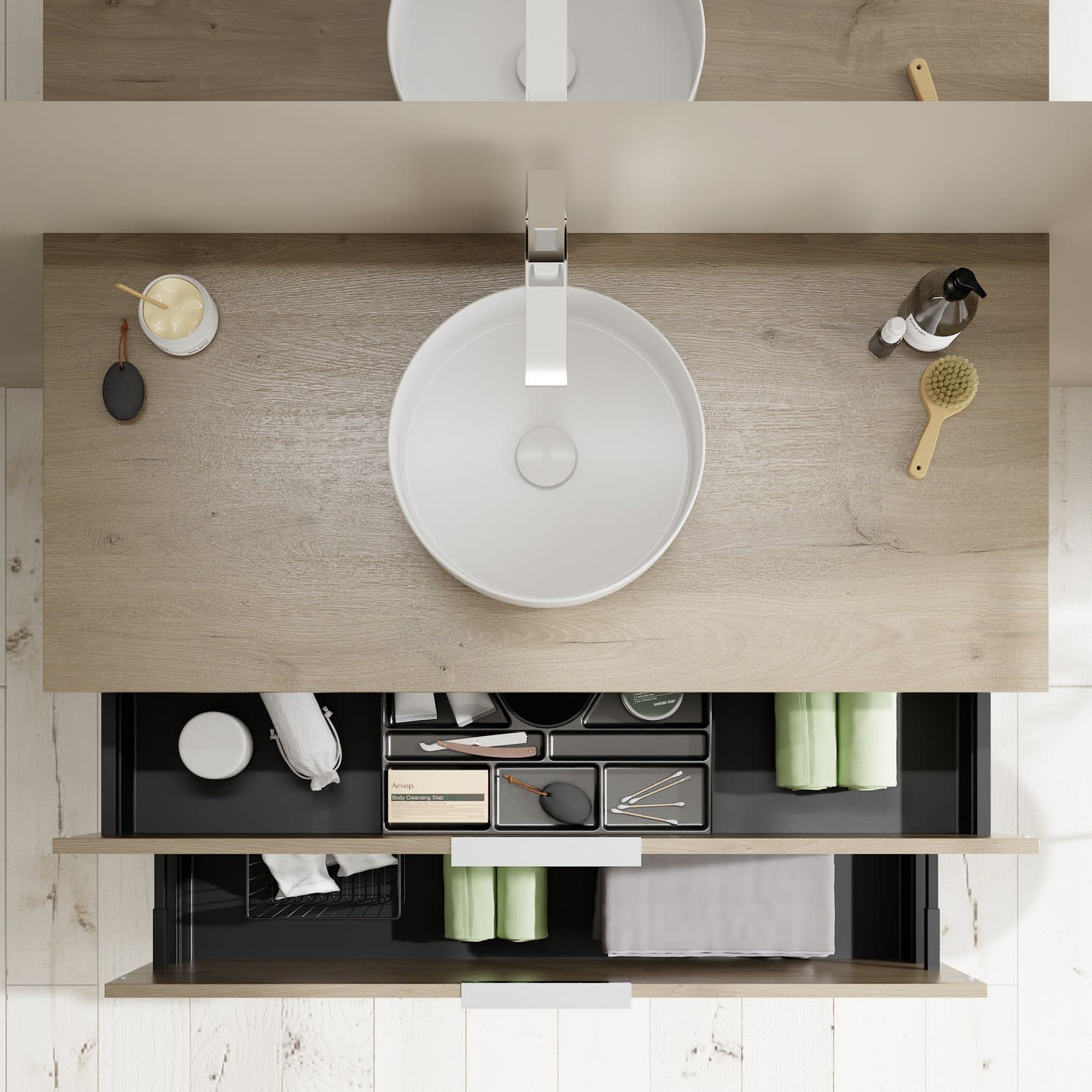 - 1 Schublade oben, 35 cm tief, mit Siphonausschnitt und Inneneinteilung