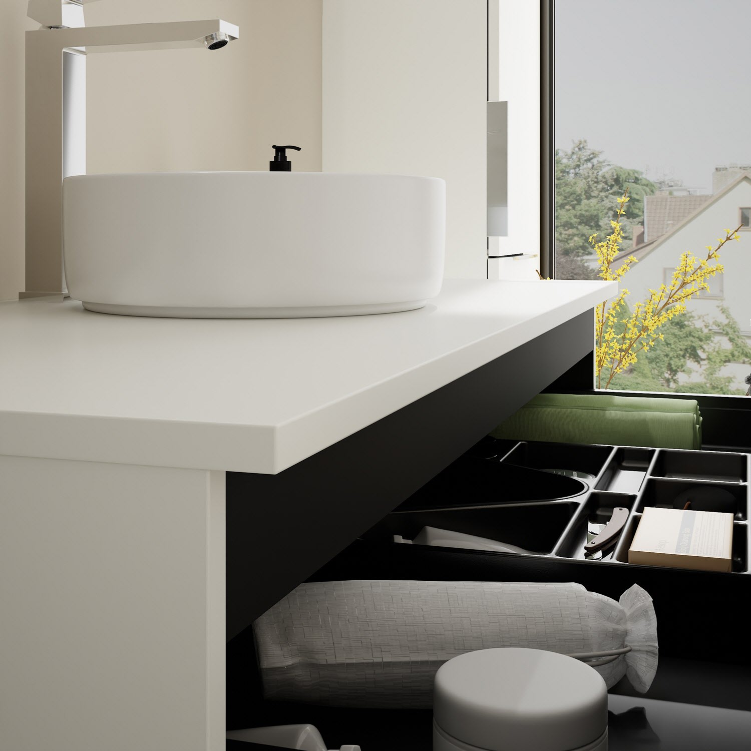 - 1 Schublade oben, 35 cm tief, mit Siphonausschnitt und Inneneinteilung