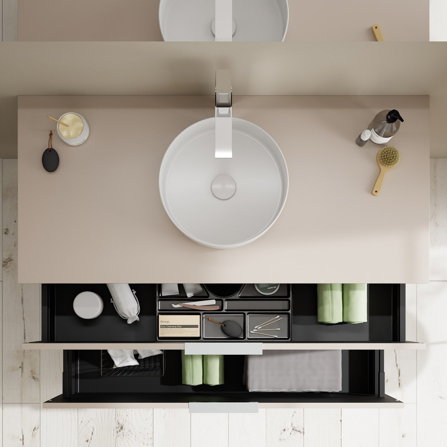 - 1 Schublade oben, 35 cm tief, mit Siphonausschnitt und Inneneinteilung