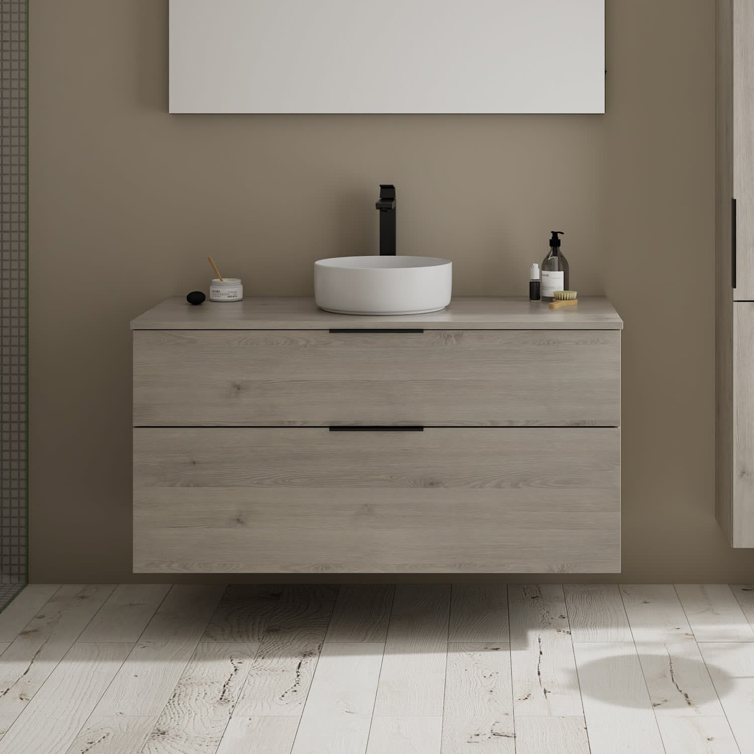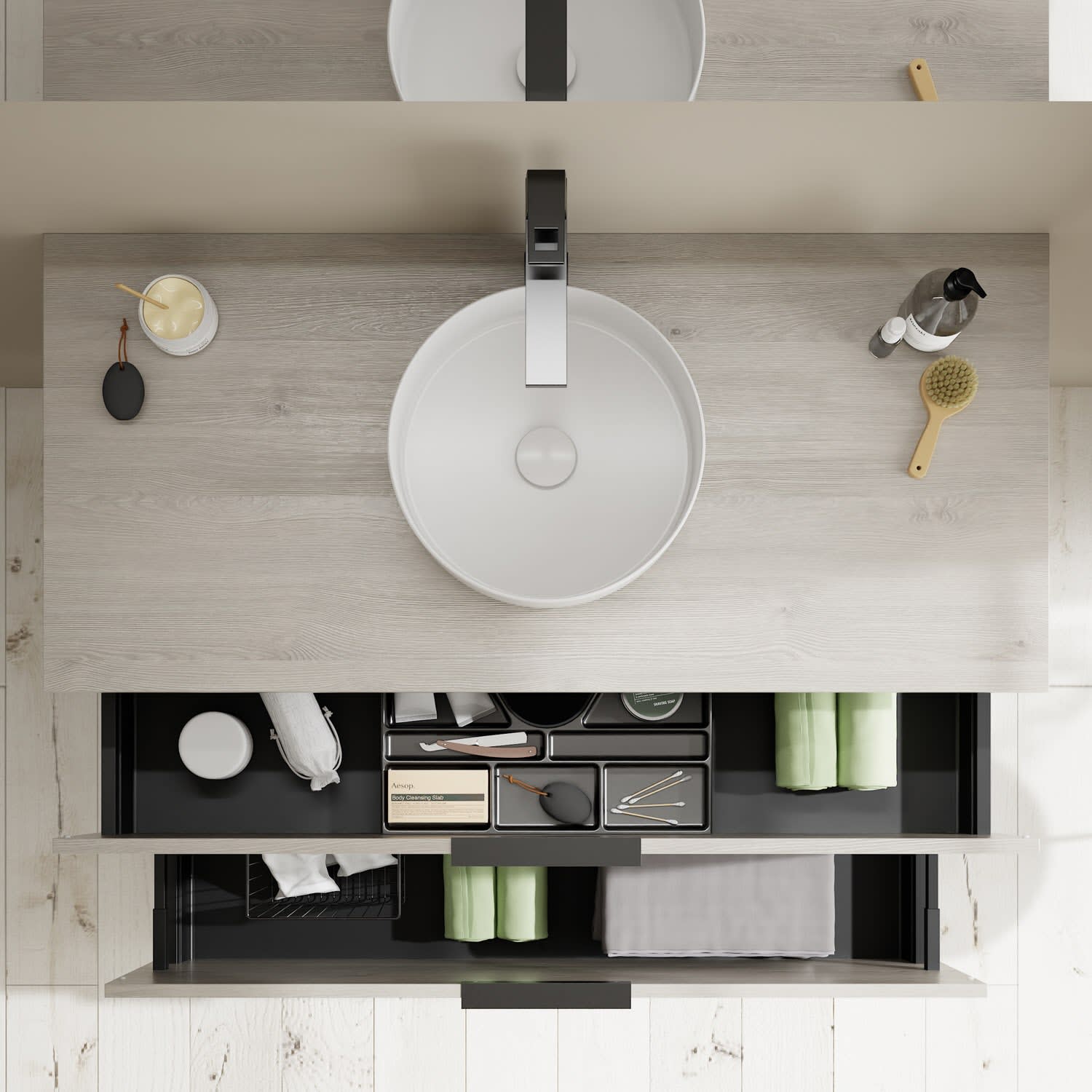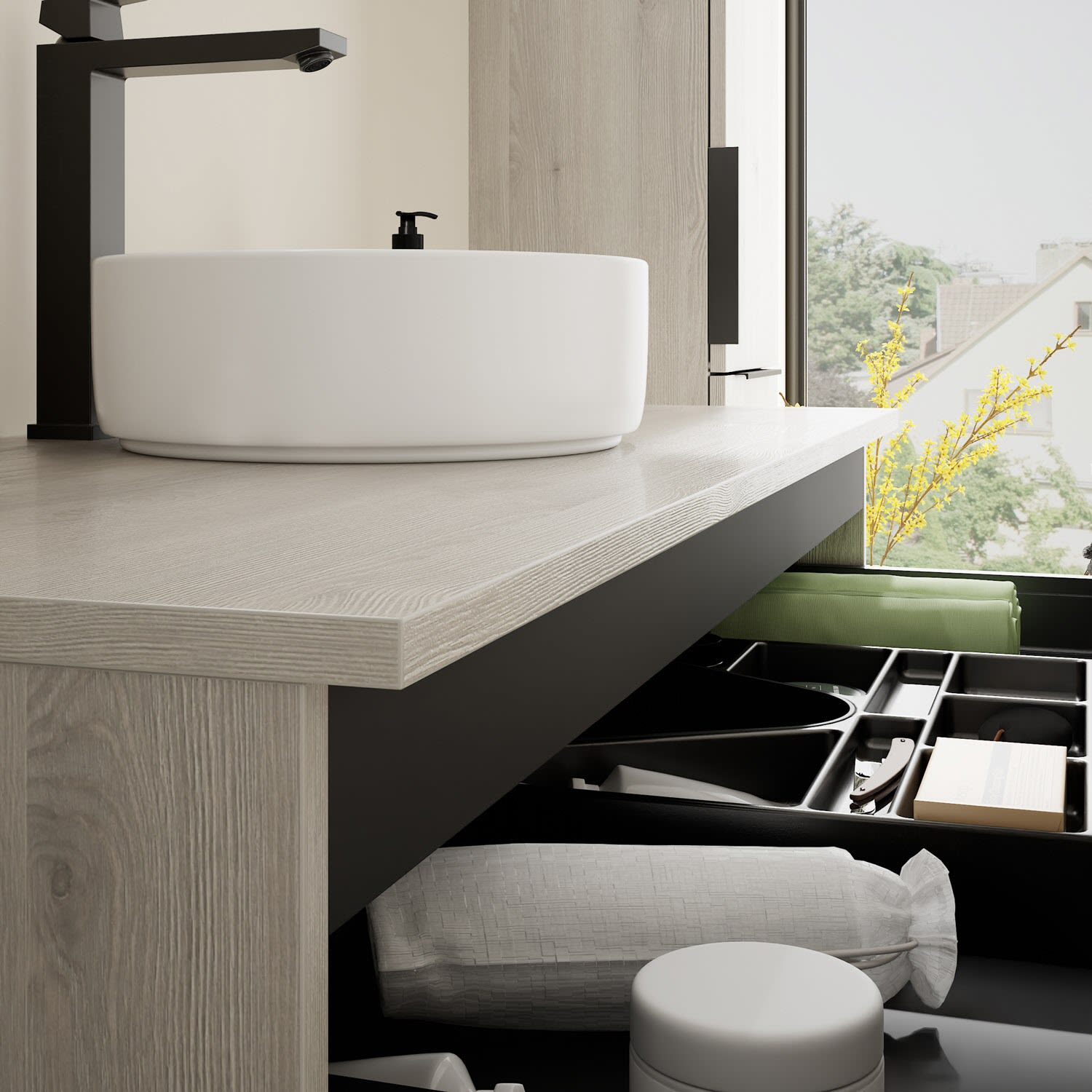 - 1 Schublade oben, 35 cm tief, mit Siphonausschnitt und Inneneinteilung
