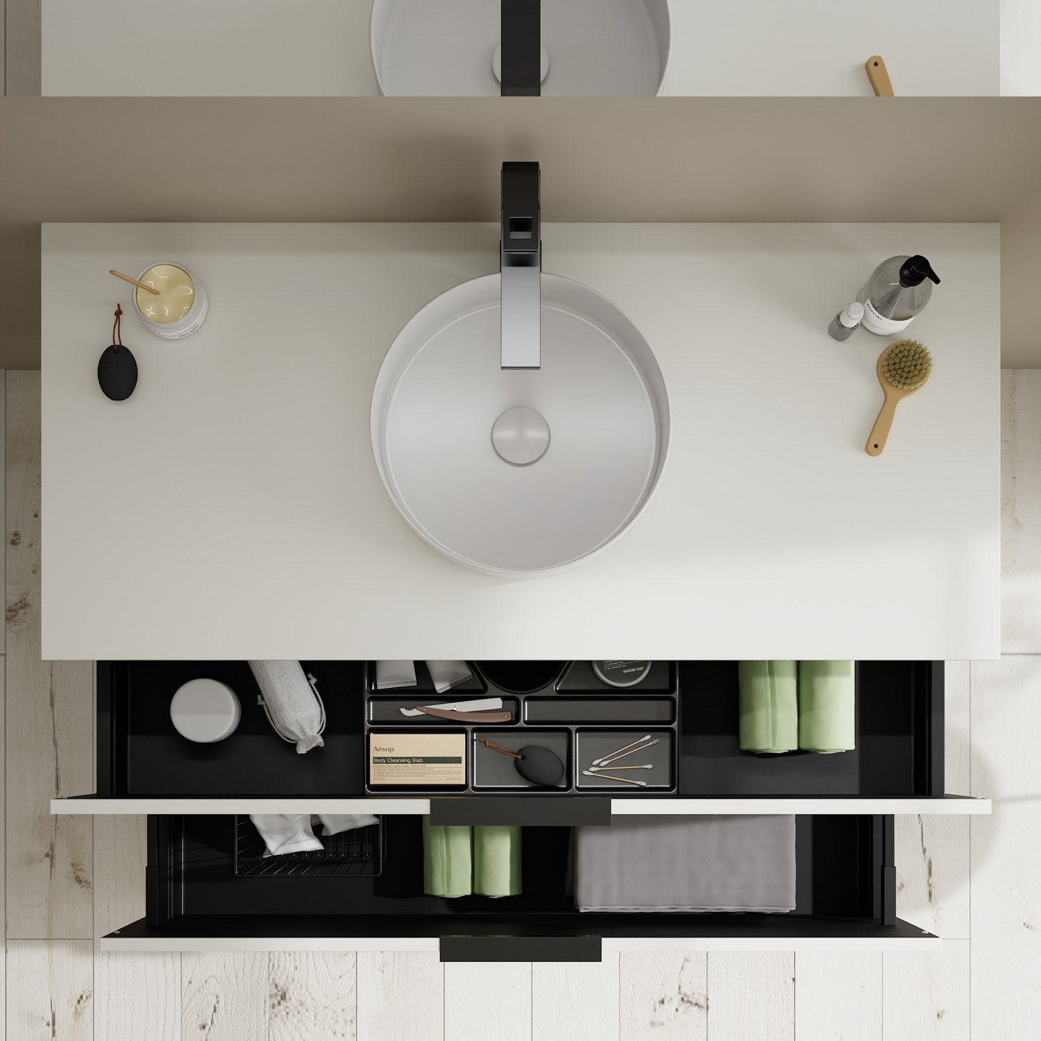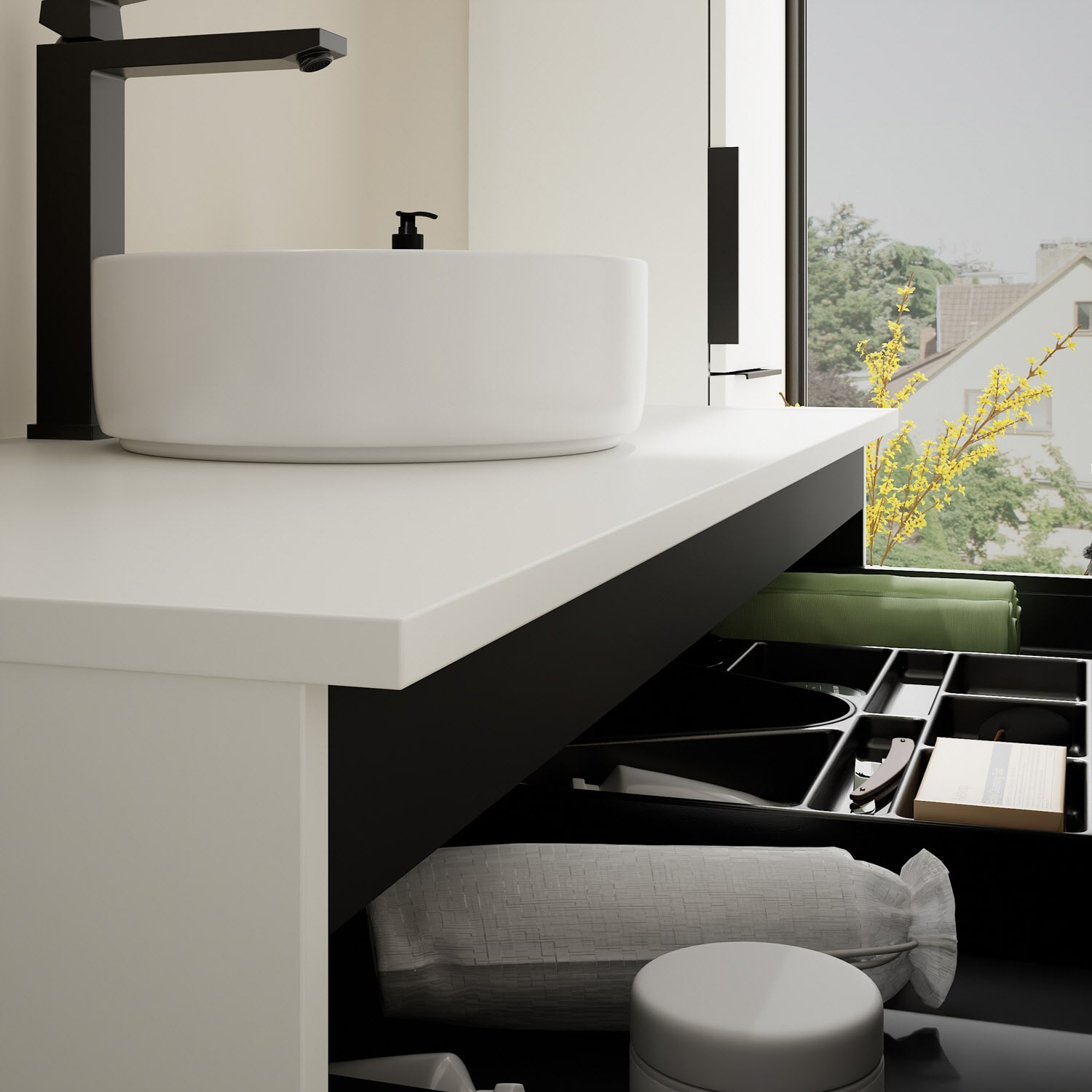 - 1 Schublade oben, 35 cm tief, mit Siphonausschnitt und Inneneinteilung