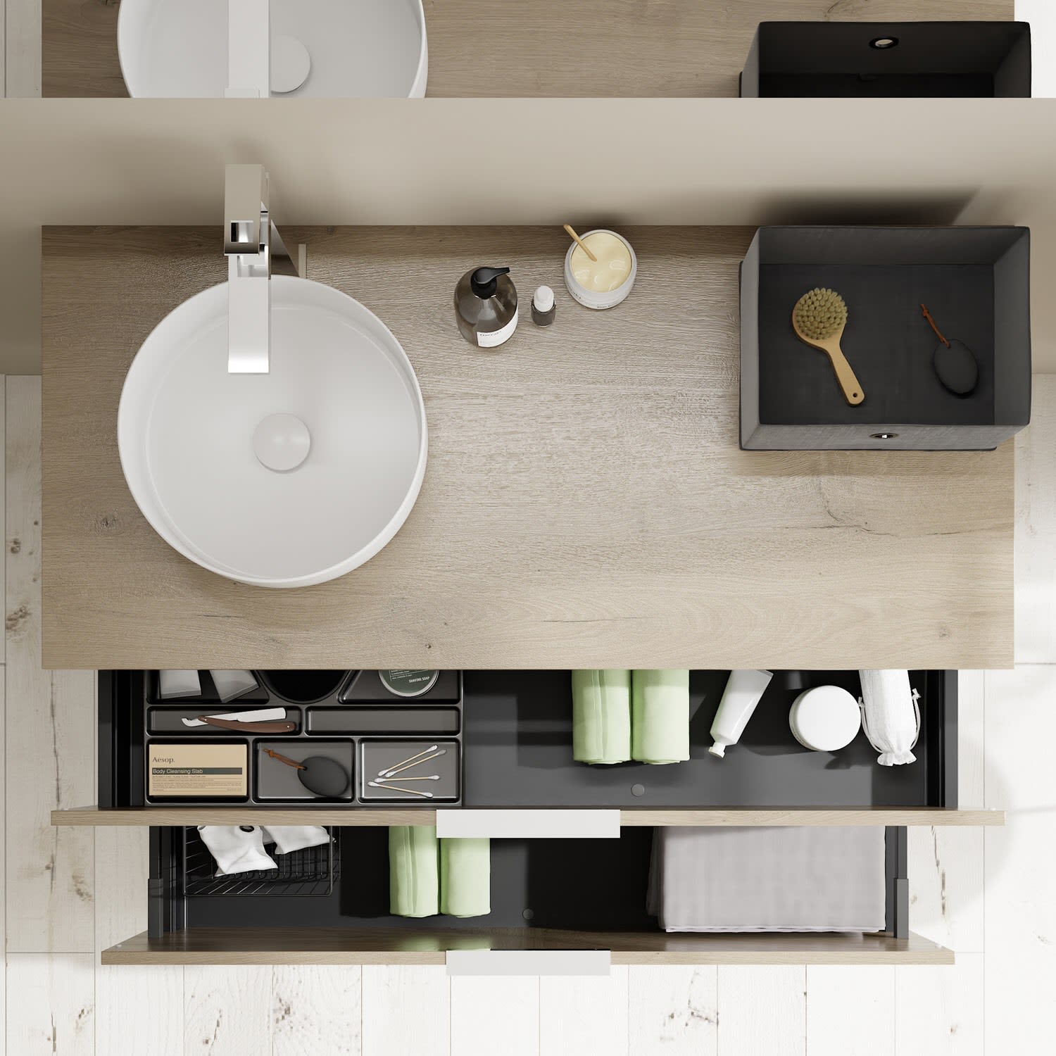 - 1 Schublade oben, 35 cm tief, mit Siphonausschnitt und Inneneinteilung