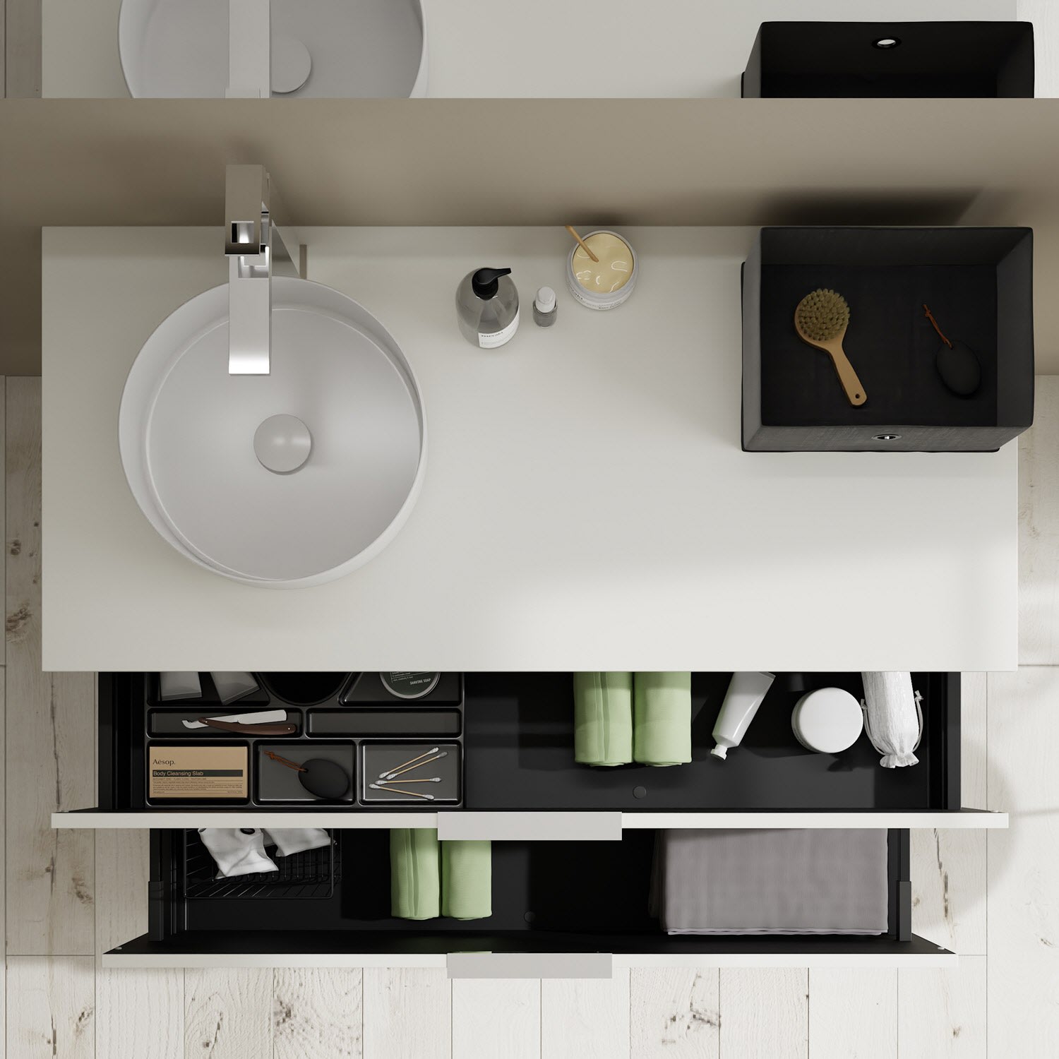 - 1 Schublade oben, 35 cm tief, mit Siphonausschnitt und Inneneinteilung