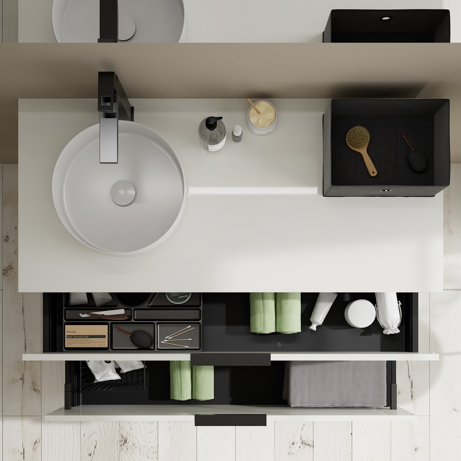 - 1 Schublade oben, 35 cm tief, mit Siphonausschnitt und Inneneinteilung