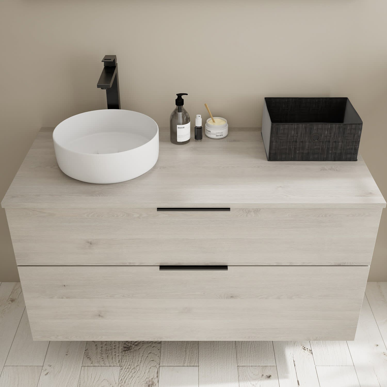 - 1 Schublade oben, 35 cm tief, mit Siphonausschnitt und Inneneinteilung