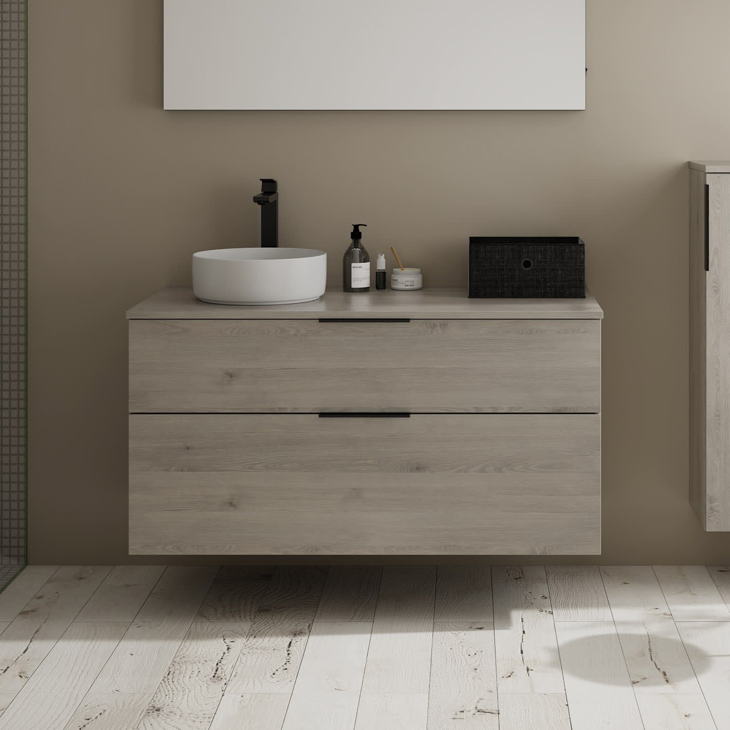 burgbad Eqio Waschtischkombination mit Keramik-Aufsatzwaschtisch 120 cm, links, mit Griff G0200