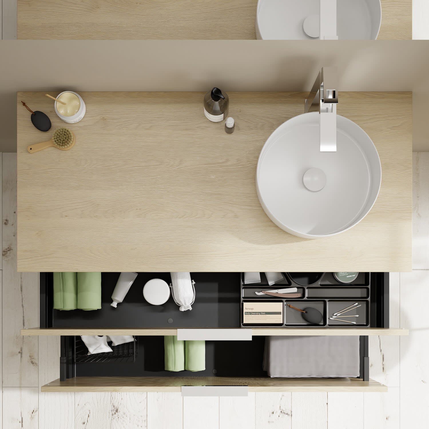 - 1 Schublade oben, 35 cm tief, mit Siphonausschnitt und Inneneinteilung