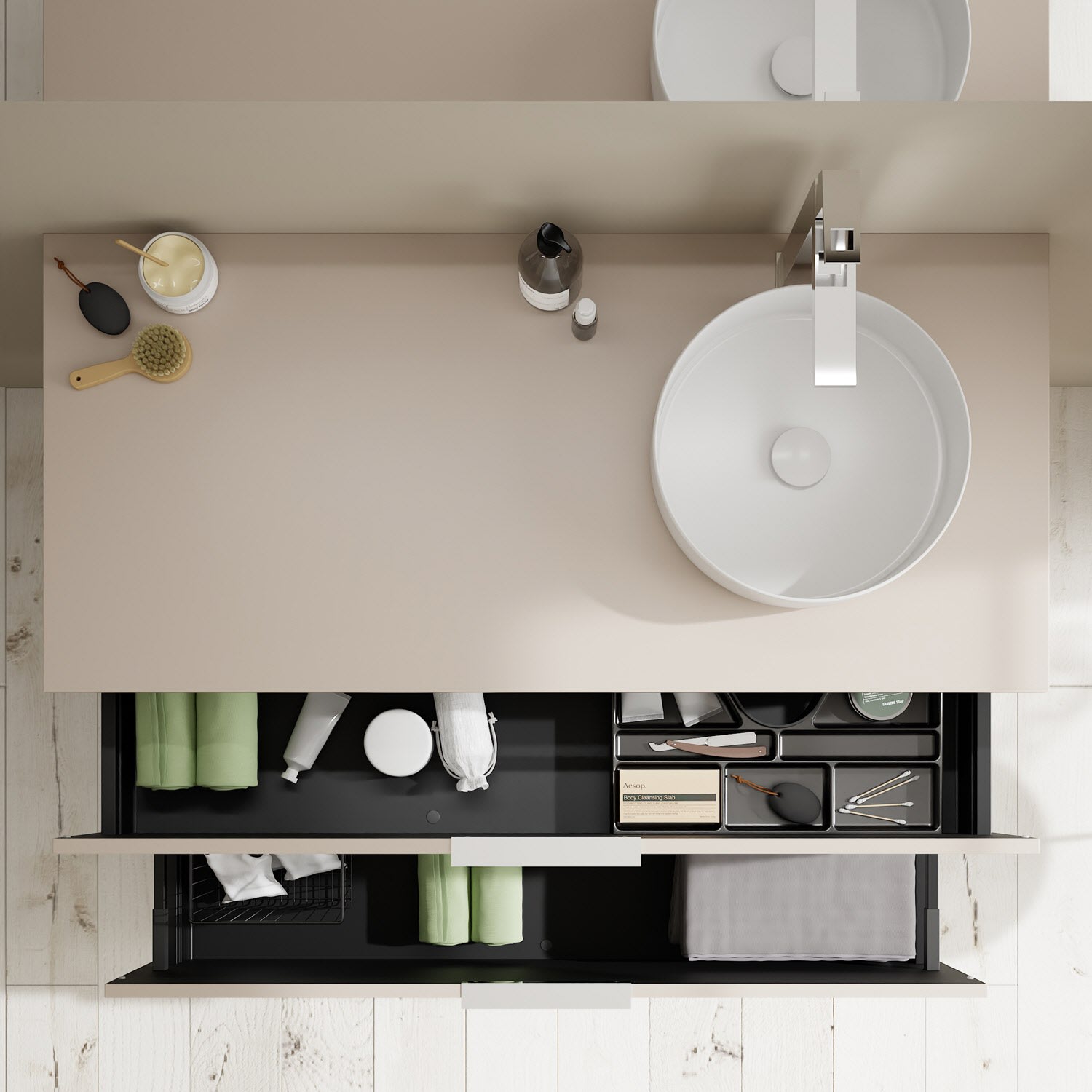 - 1 Schublade oben, 35 cm tief, mit Siphonausschnitt und Inneneinteilung