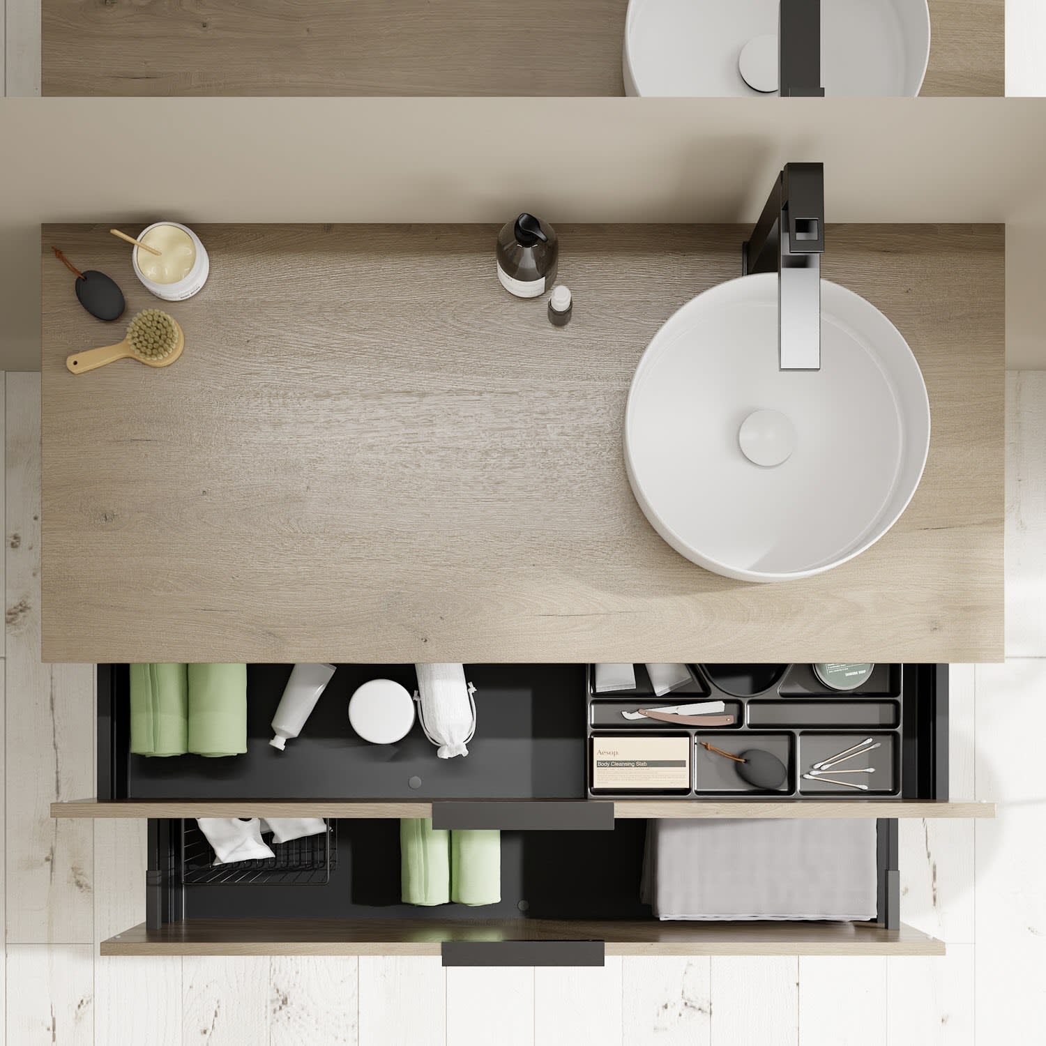 - 1 Schublade oben, 35 cm tief, mit Siphonausschnitt und Inneneinteilung