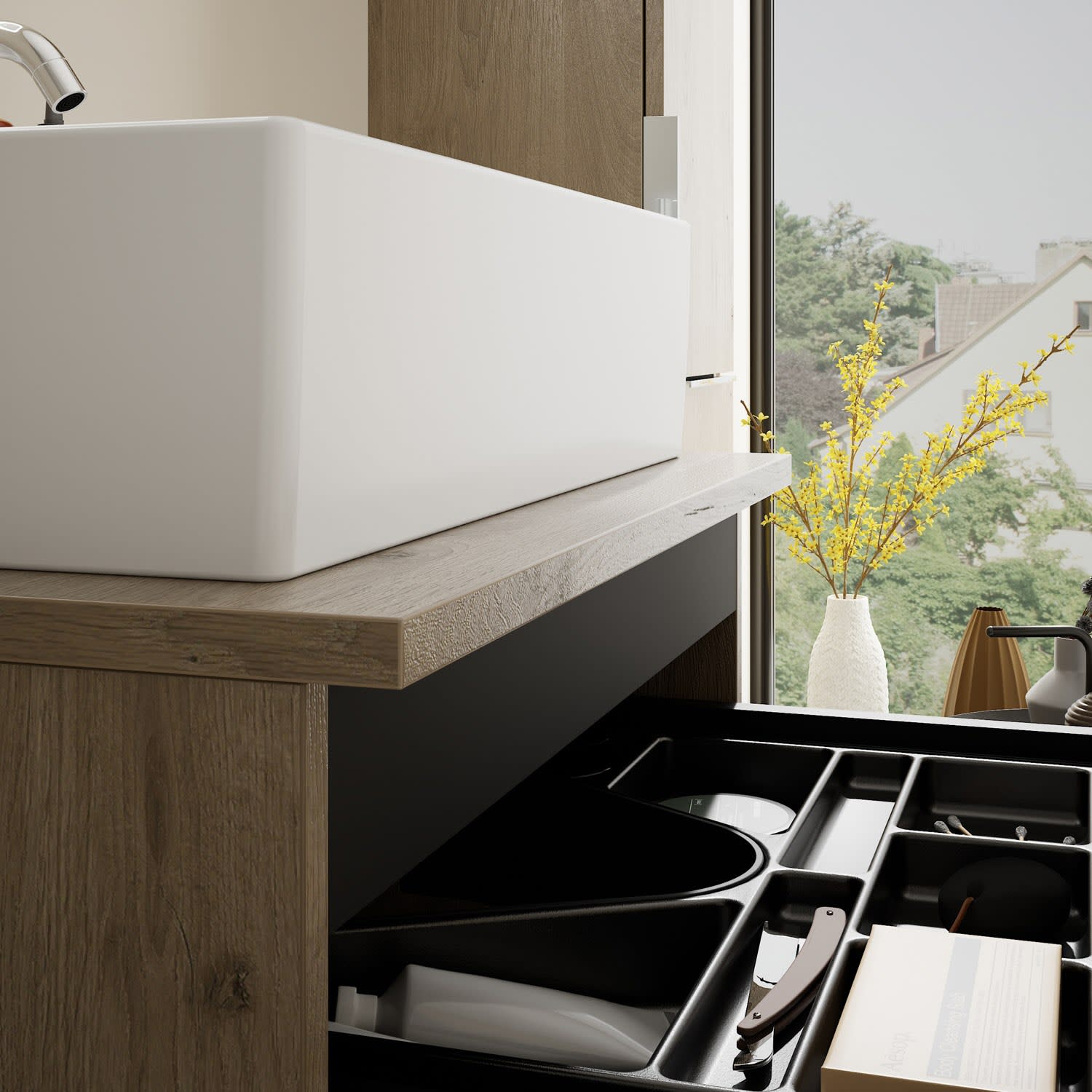 - 1 Schublade oben, 35 cm tief, mit Siphonausschnitt und Inneneinteilung