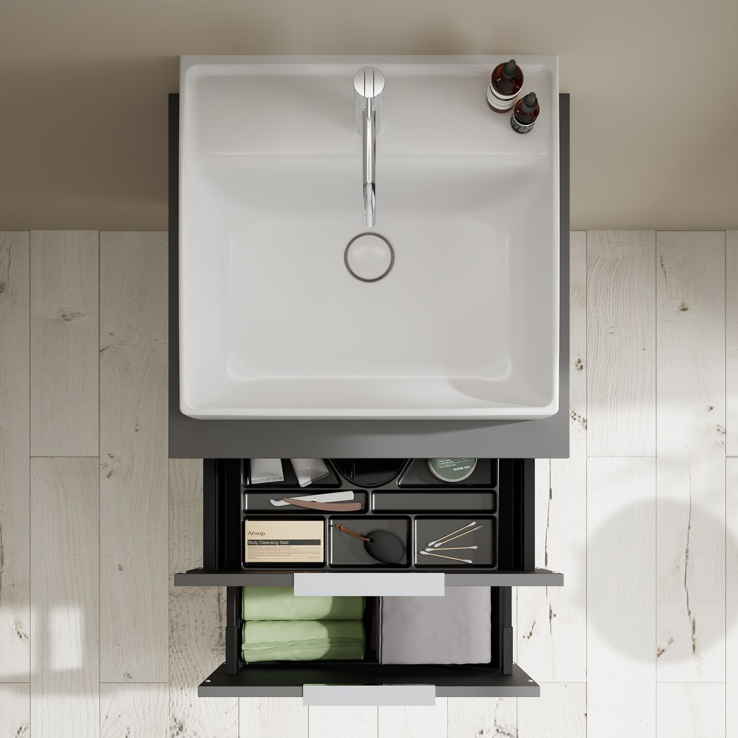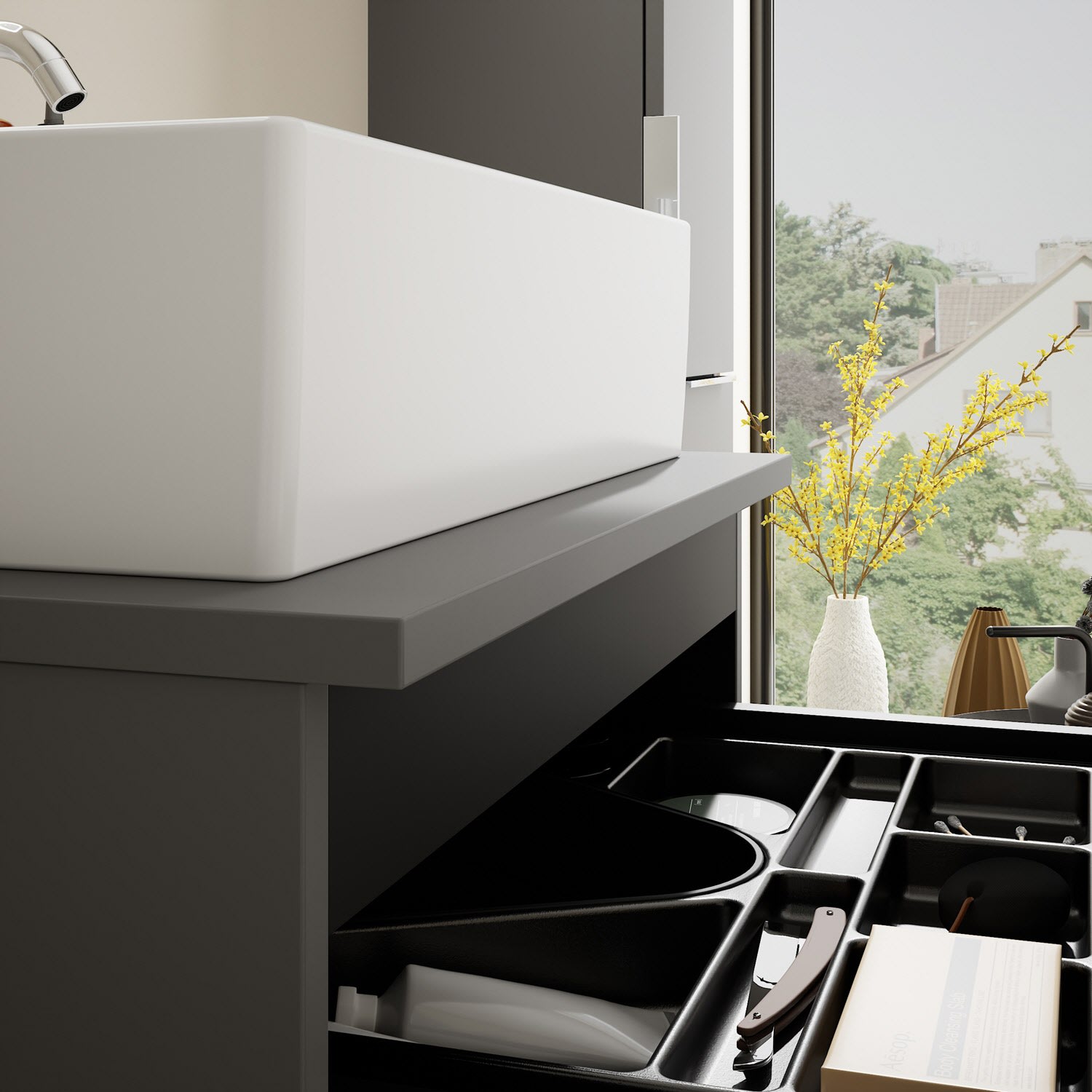 - 1 Schublade oben, 35 cm tief, mit Siphonausschnitt und Inneneinteilung