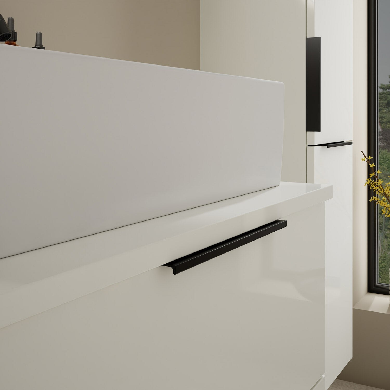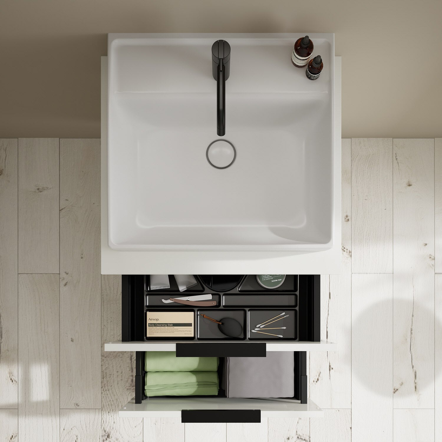 - 1 Schublade oben, 35 cm tief, mit Siphonausschnitt und Inneneinteilung